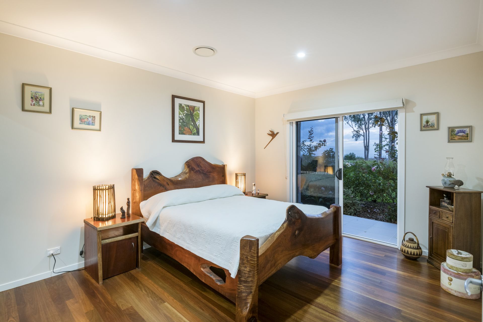 > Bedroom one is the home's master bedroom. This enormous light filled space is located upstairs with panoramic views of the Glasshouse Mountains. This room features parents retreat, polished timber flooring, custom large walk-in robe, ensuite, ceiling fan, ducted air-conditioning & Crimsafe screens.