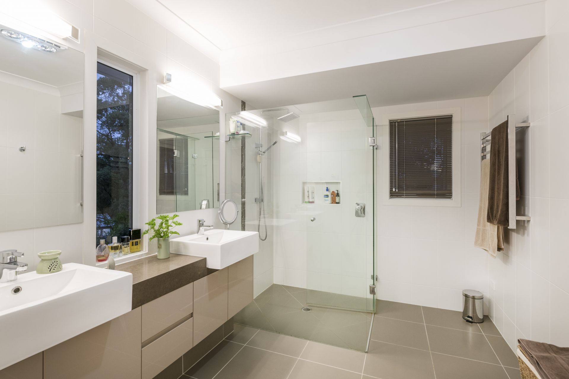 > Bathroom two is the upstairs master ensuite featuring tiled flooring, shower, separate soft-close toilet, double vanity with mirror above & storage under, floor to ceiling tiles & heated towel rails.