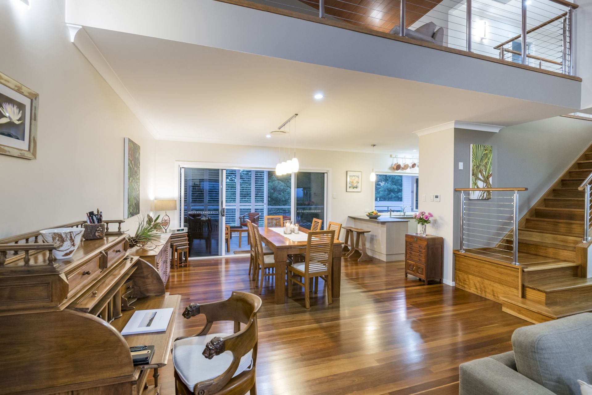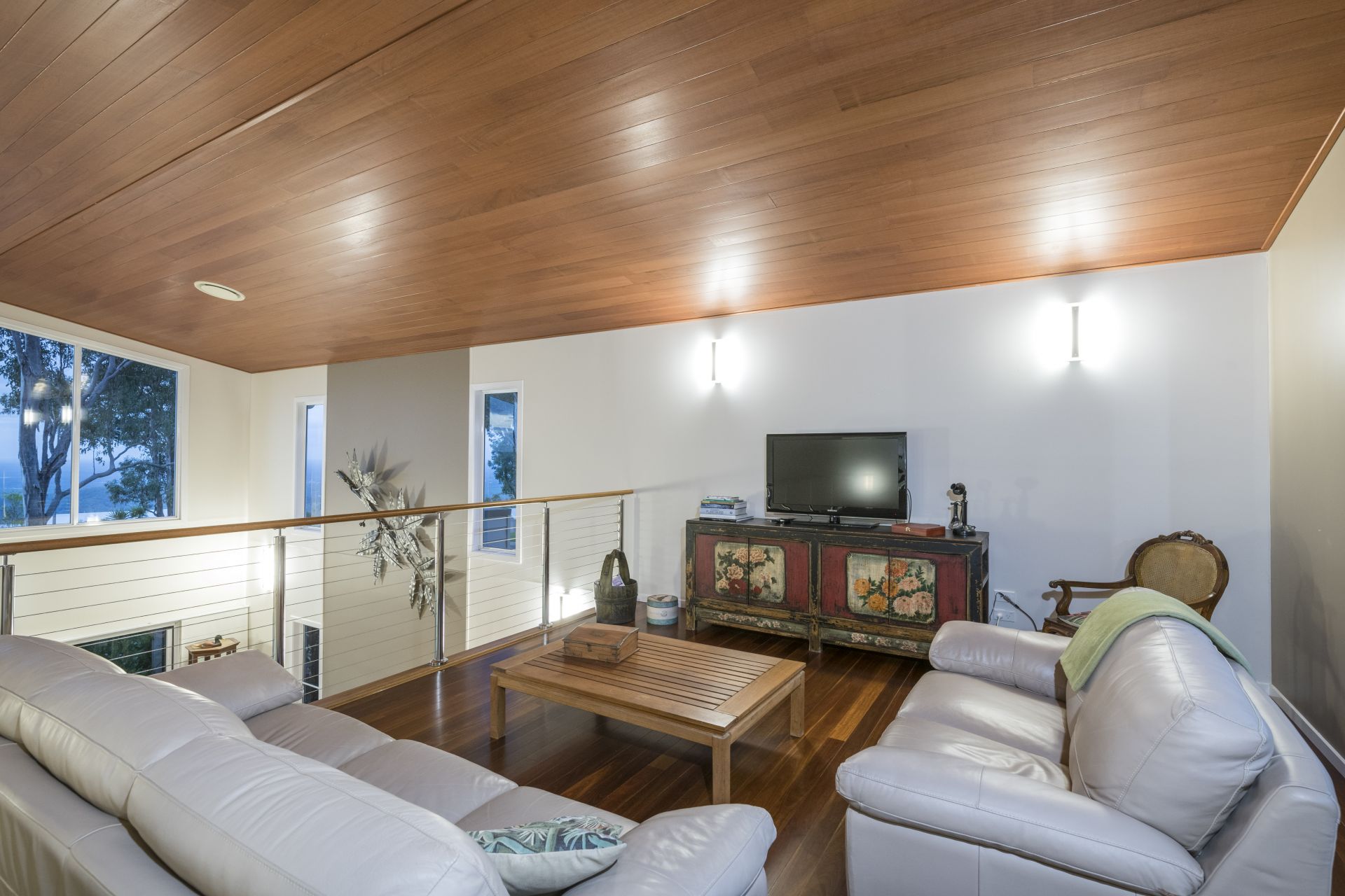 > The mezzanine level or lounge room, overlooking the formal lounge provides separate living with picturesque views of the Glasshouse Mountains beyond.