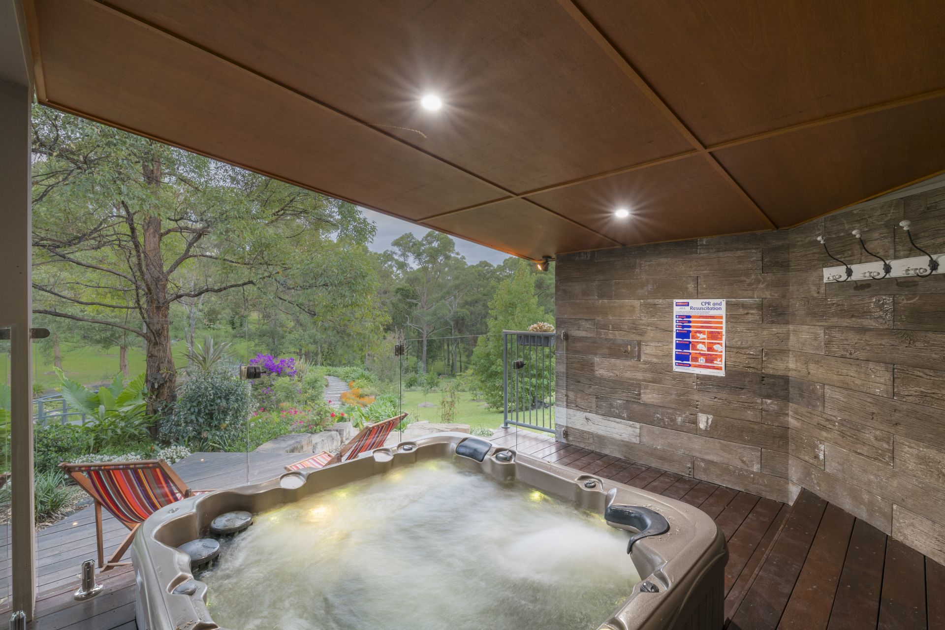 > Outside is a good sized covered veranda with power outlet & spa that overlooks the incredible gardens & dam