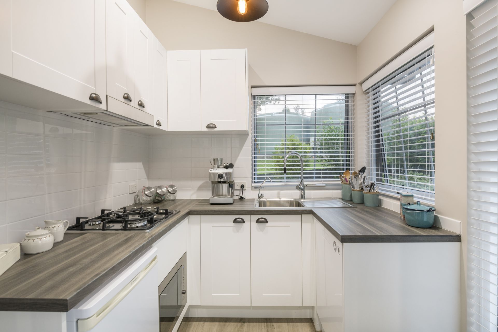 > Kitchenette with tiled flooring, 4 burner gas cooktop, built-in microwave & space for a bar-fridge.