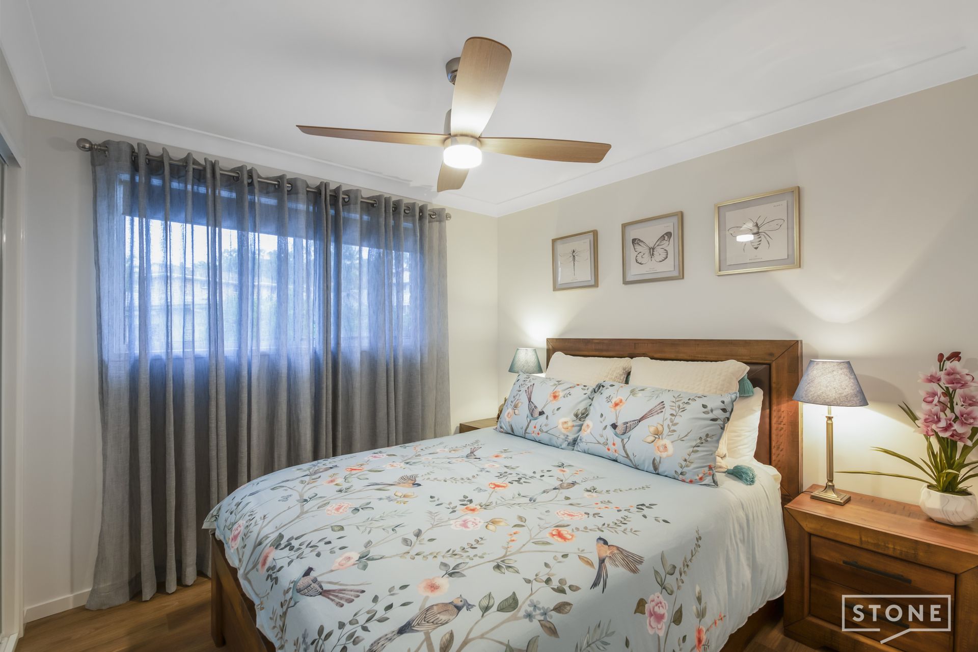 > Bedroom 2 located on the entry level enjoys mirror faced built-in-robe with custom internals, , Panasonic split-system air-conditioning, ceiling fan, LED down-lighting, sliding windows with combination of roller blind and curtains