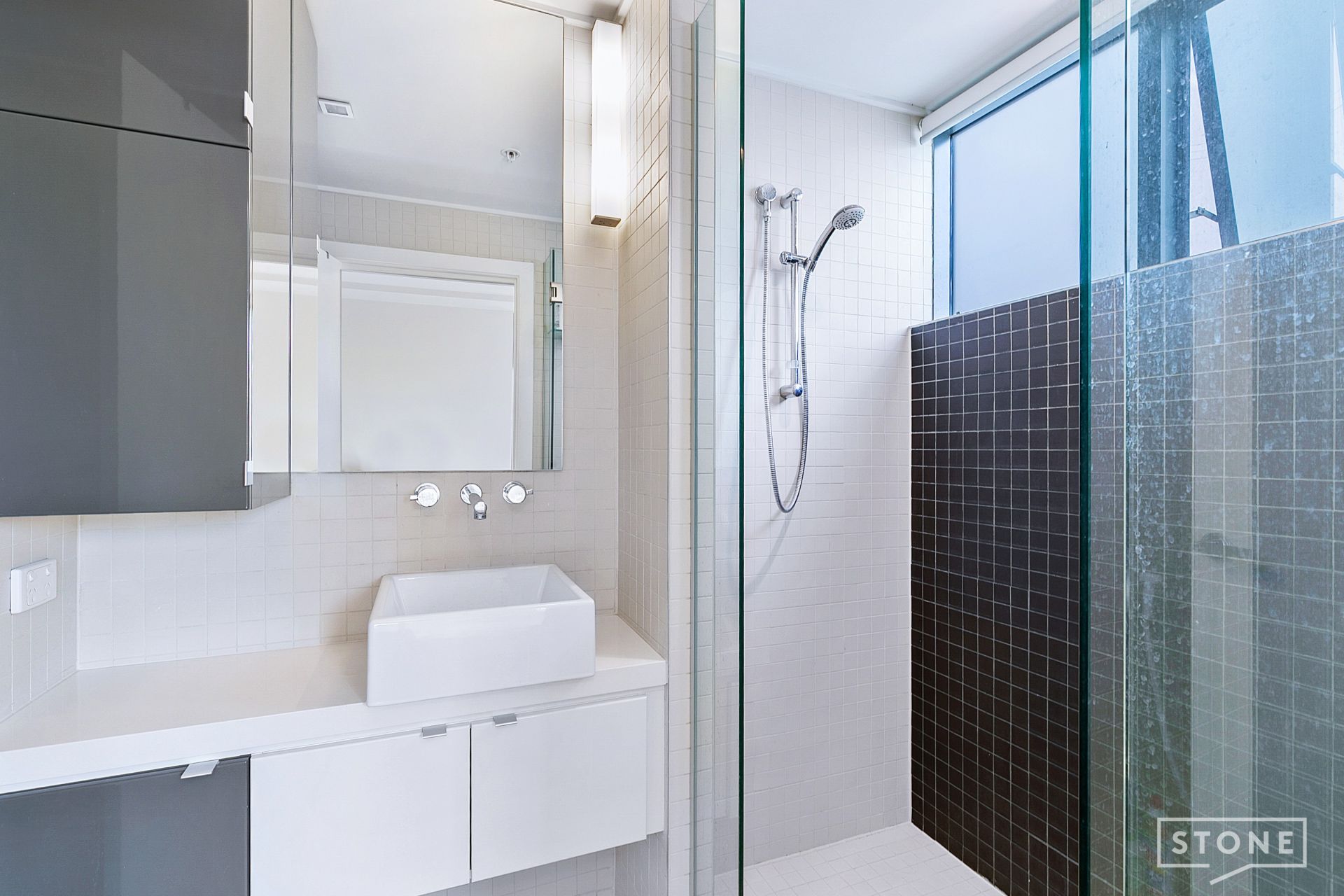 > The ensuite to the master bedroom features a top mounted basin vanity with plenty of storage, stone bench-top, frame-less vanity mirror, towel rails, towel hooks, separate shower configuration and a toilet