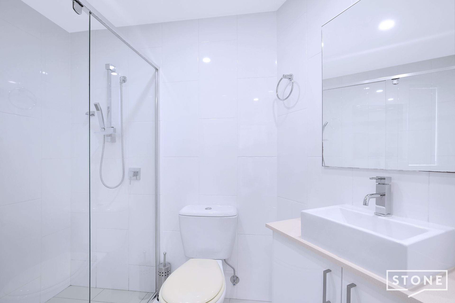 > The ensuite features stone benchtop, modern vanity with freestanding sink, seamless glass shower, plus vanity mirror
