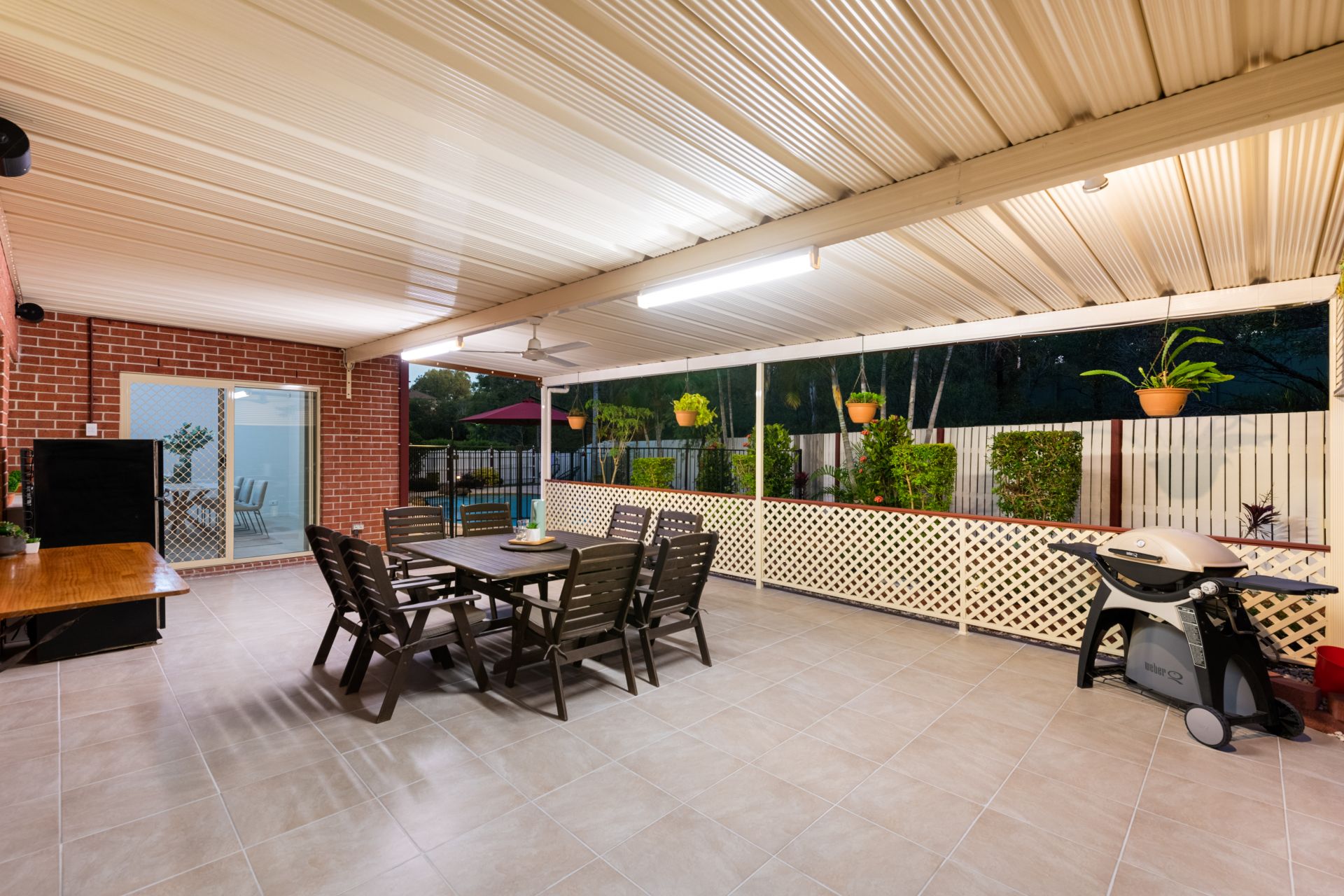 - Private alfresco entertaining area off the home's living room is the perfect place to entertain a large group of friends or just sit and enjoy the privacy of your own oasis. It features tiled flooring, integrated speaker system, ceiling fans, lighting and outdoor power.