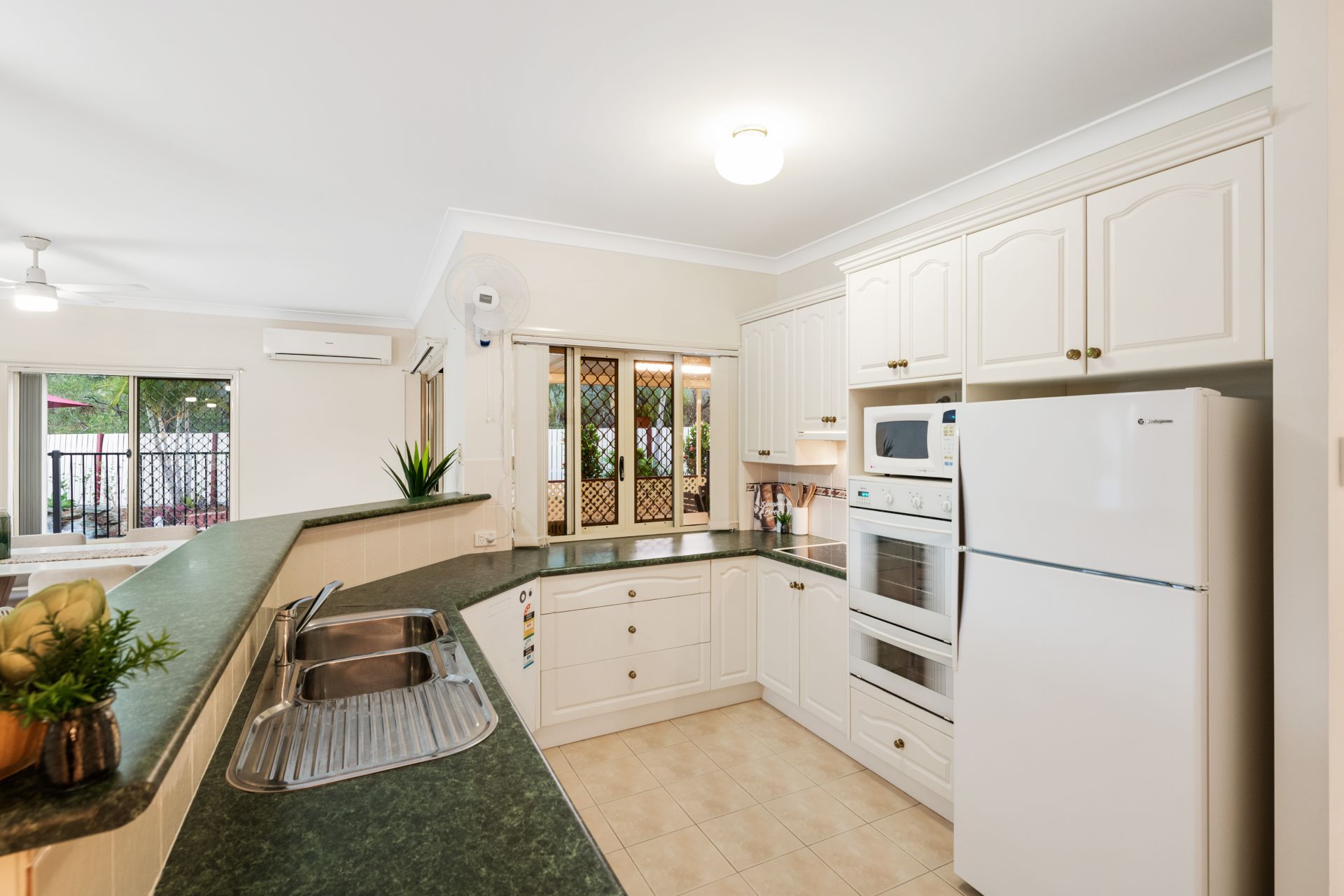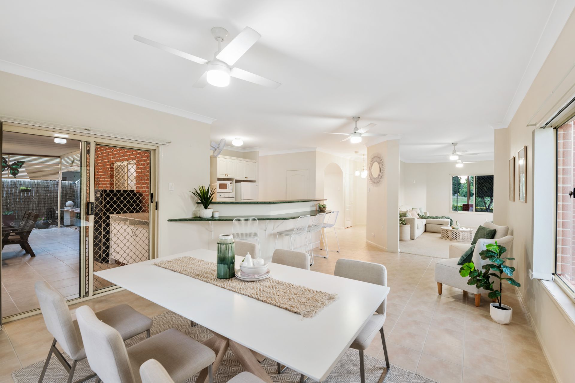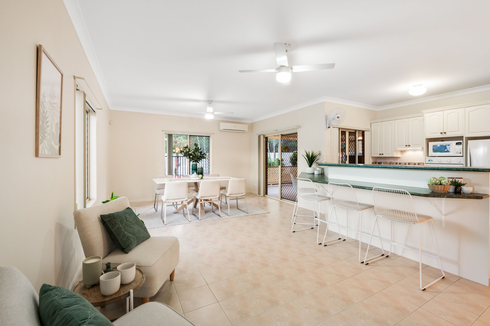 - Living room and meals area both share an open plan with the home's kitchen and look out over the in-ground pool and back yard. They feature tiled flooring, split system air-conditioning, ceiling fans and access to the large private alfresco entertaining area.