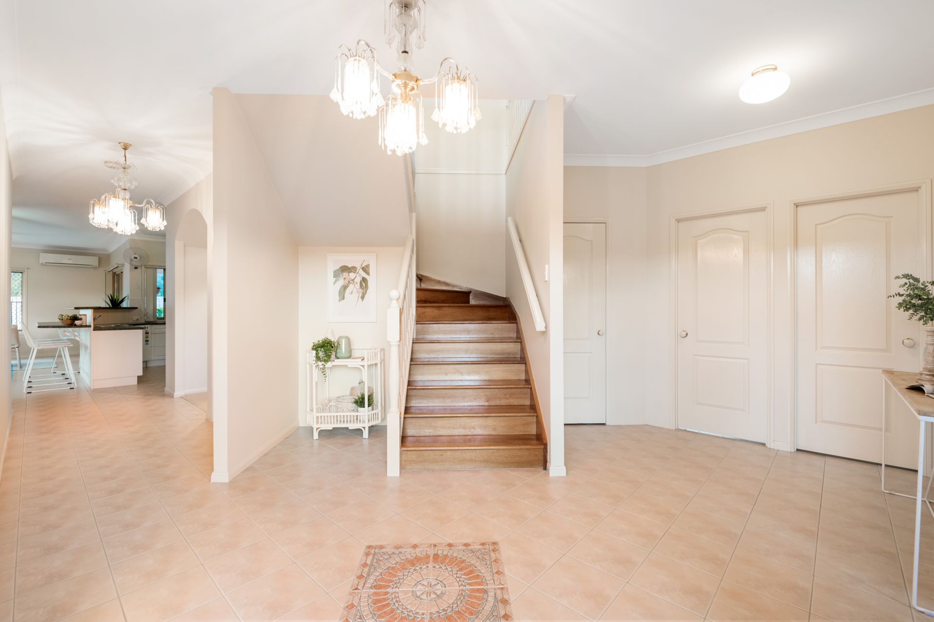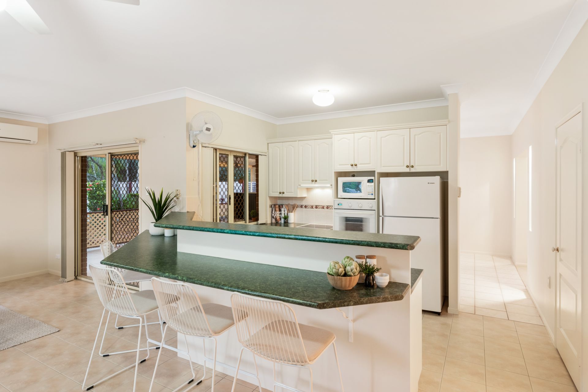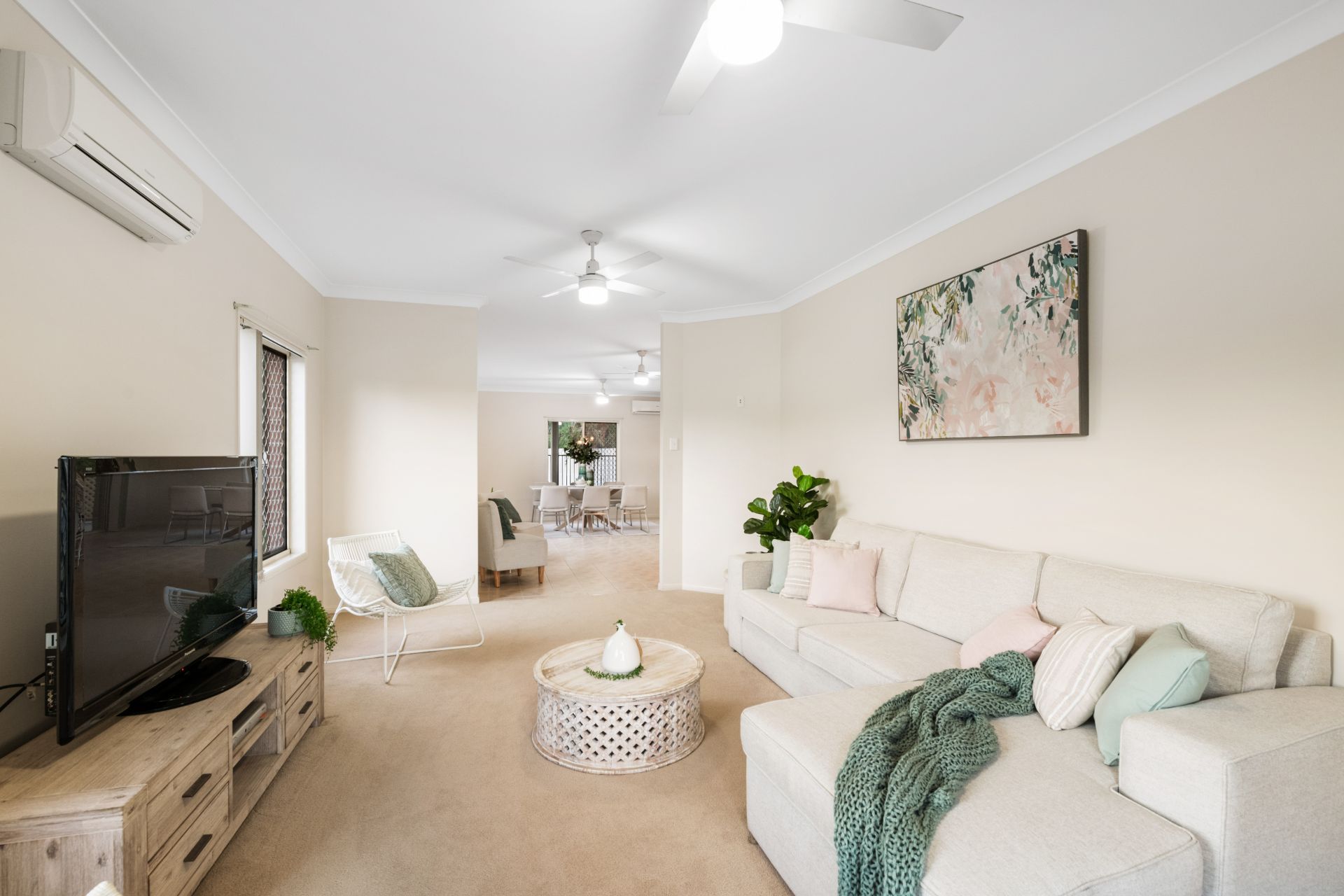 - Living room and meals area both share an open plan with the home's kitchen and look out over the in-ground pool and back yard. They feature tiled flooring, split system air-conditioning, ceiling fans and access to the large private alfresco entertaining area.