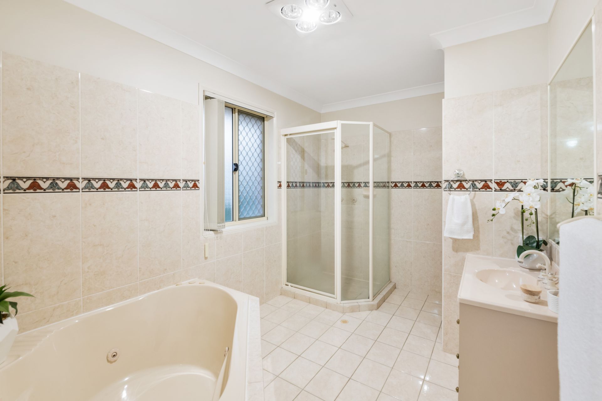 - Bathroom two is the over-sized ensuite to the master bedroom and features tiled flooring, shower, spa, single vanity and toilet.