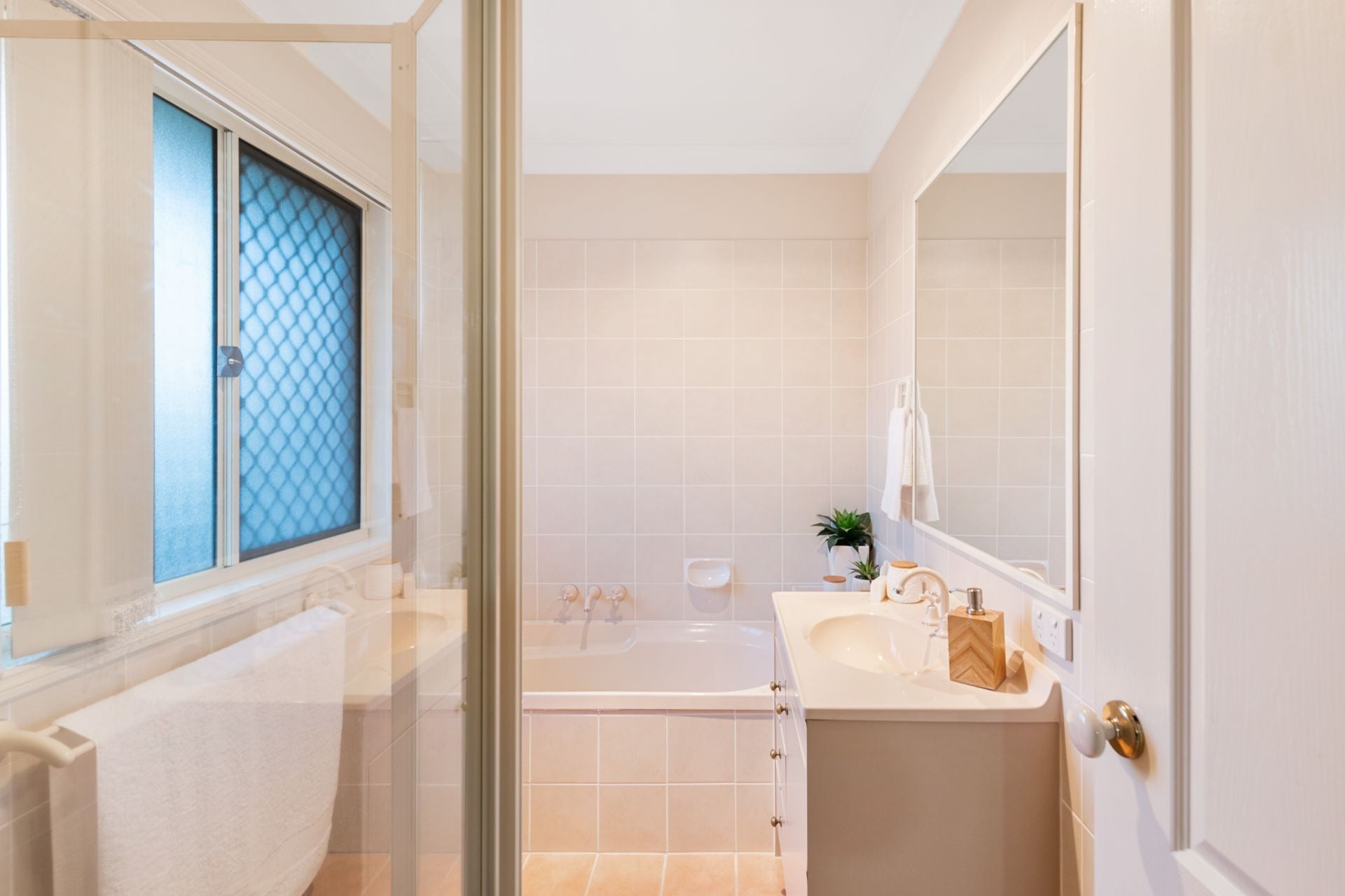 - Bathroom one is the home's main bathroom and features tiled flooring, shower, separate bath, single vanity and separate toilet.