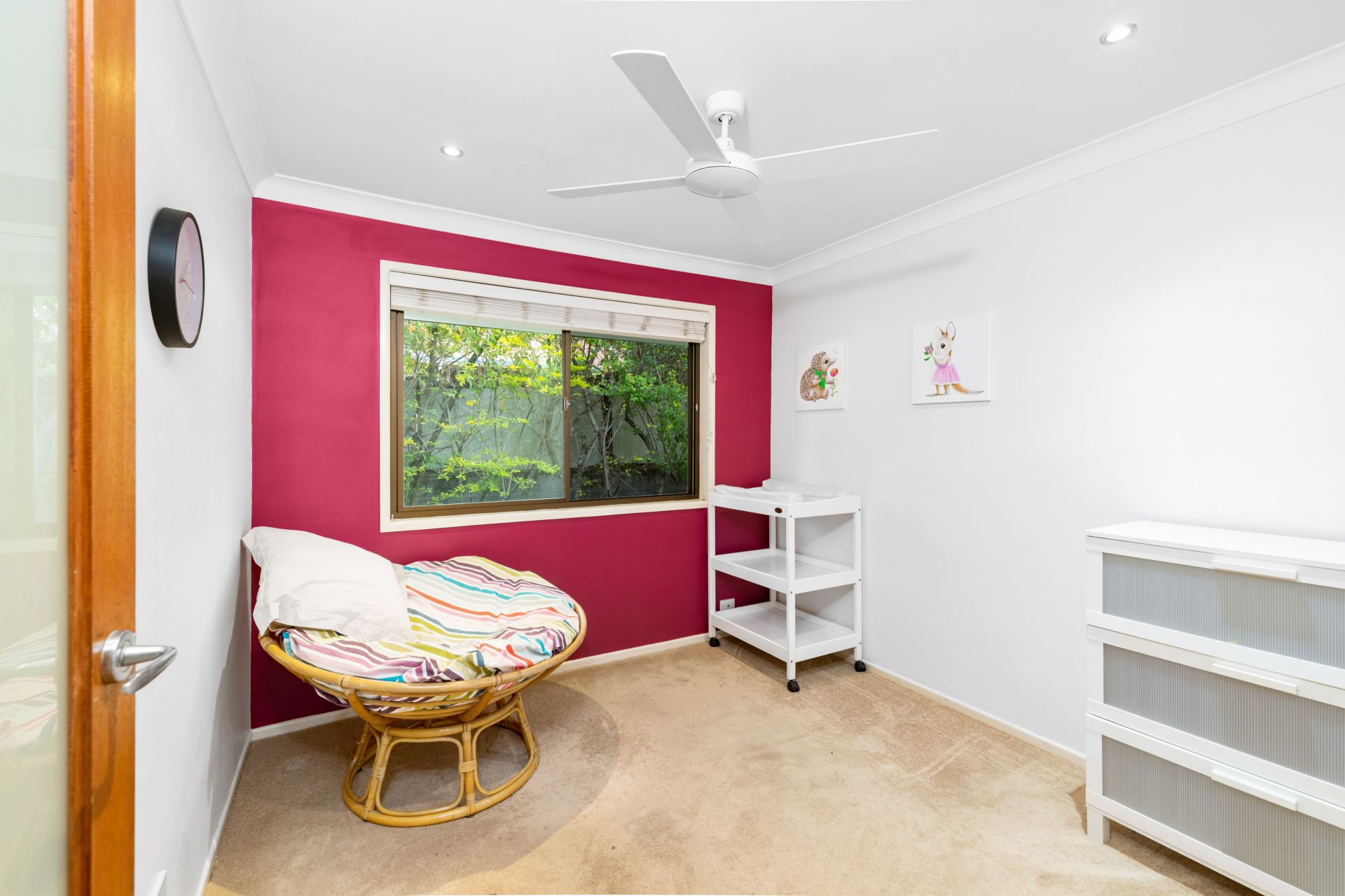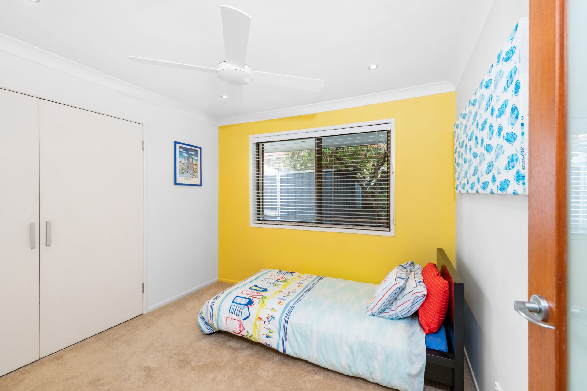 - Bedroom three features carpeted flooring, ceiling fan and built-in-robe.
