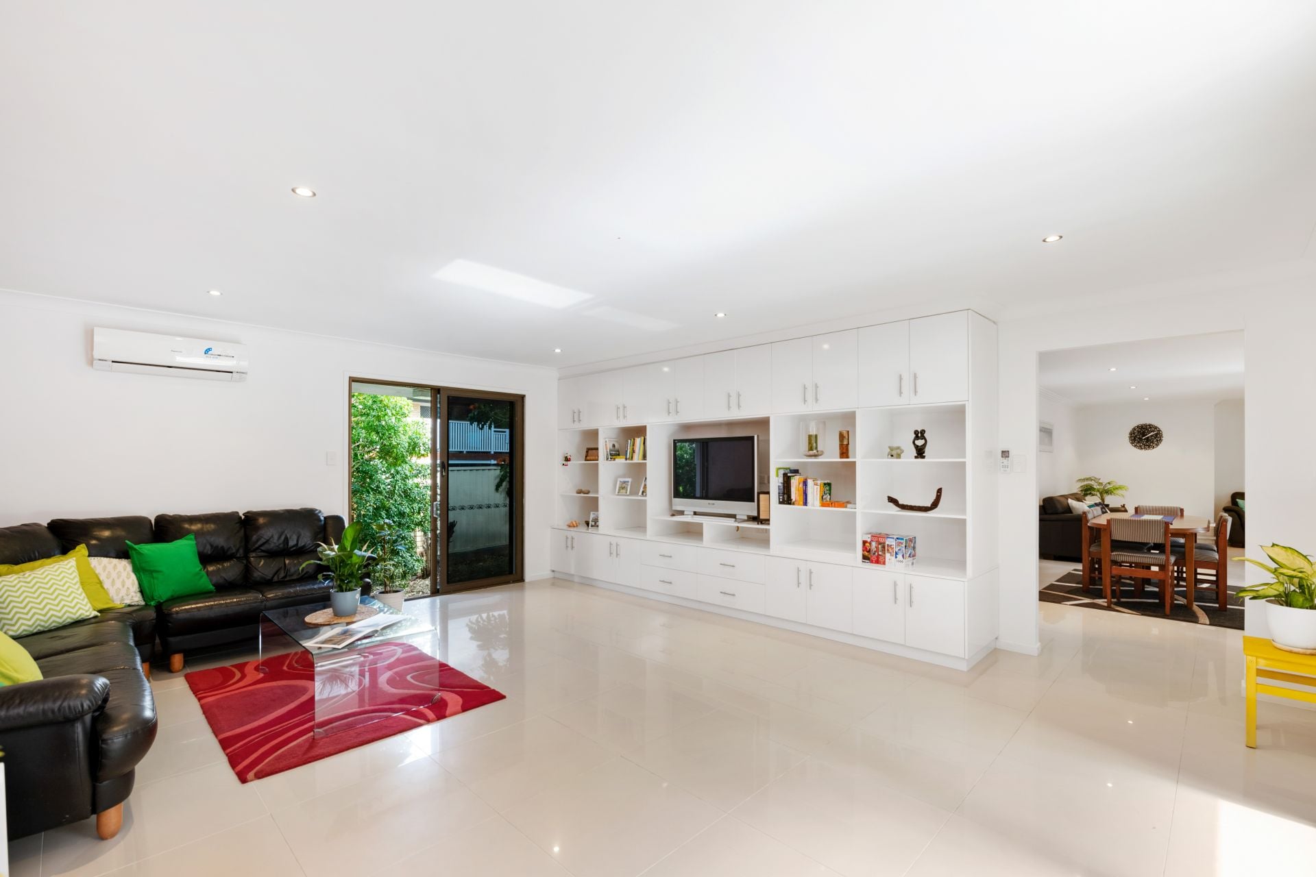 - Lounge room is a large separate living space featuring tiled flooring, split system air-conditioning, built-in display/tv cabinet and access to both the outdoor entertaining area and backyard.