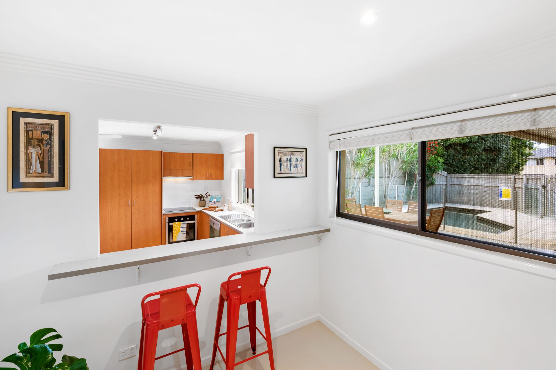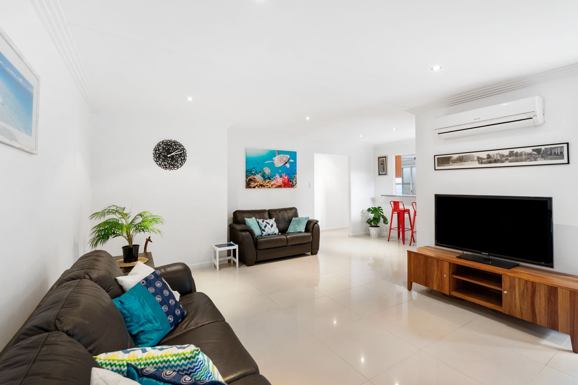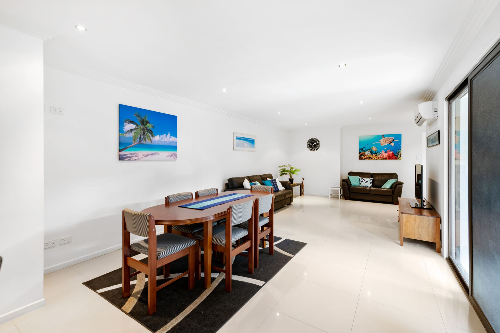 - Living room and dining area share an open plan. Conveniently positioned beside the kitchen, this room features tiled flooring, split system air-conditioning and access to the private outdoor entertaining area and in-ground pool.