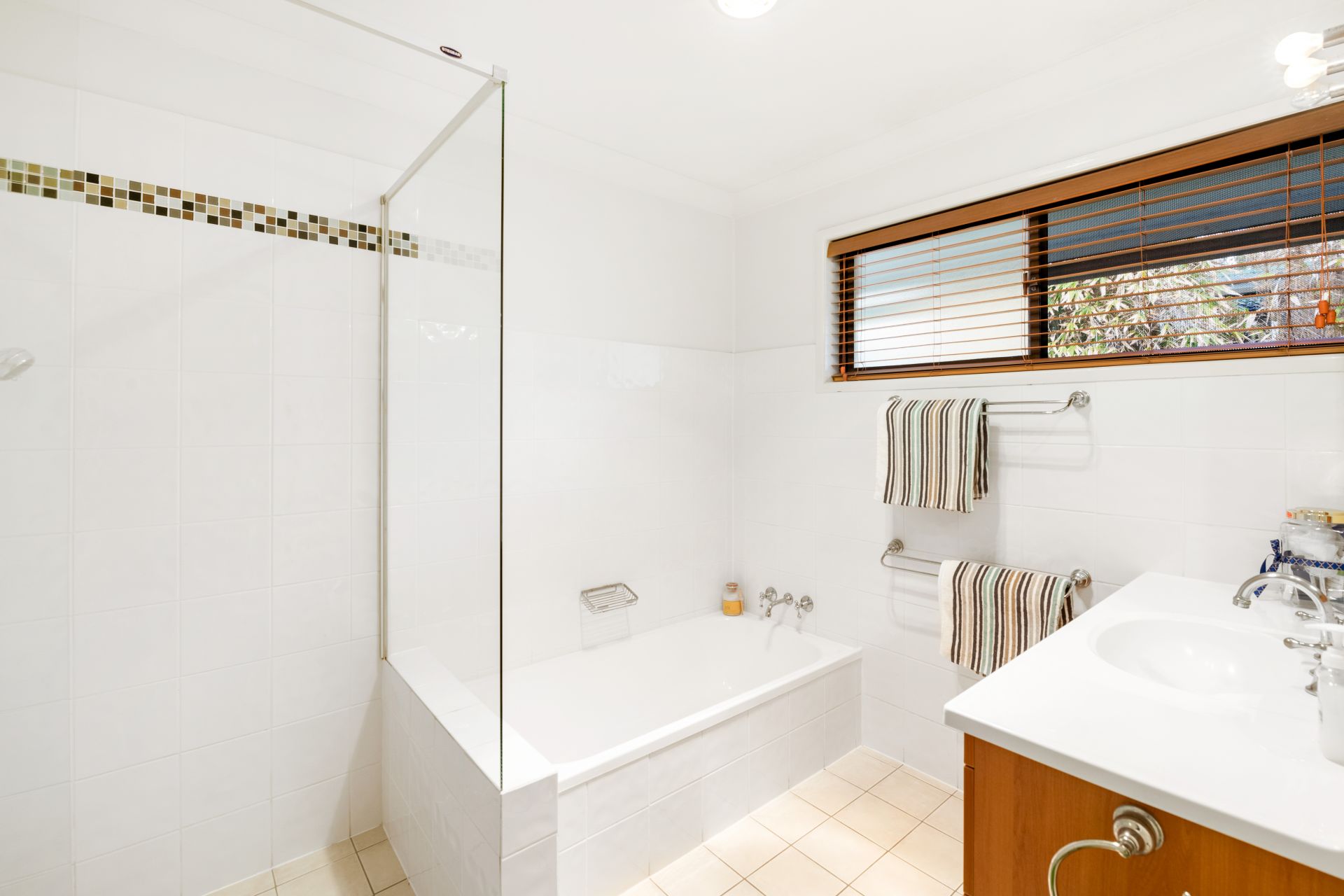 - Bathroom one is the home's main bathroom and features tiled flooring, shower, separate bath, single vanity and separate toilet.
