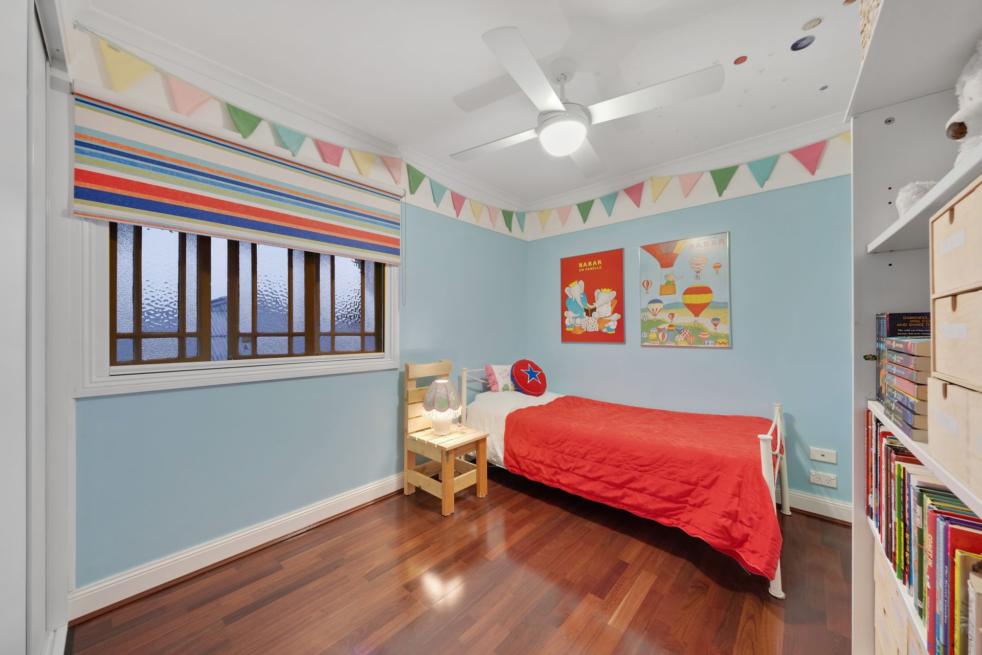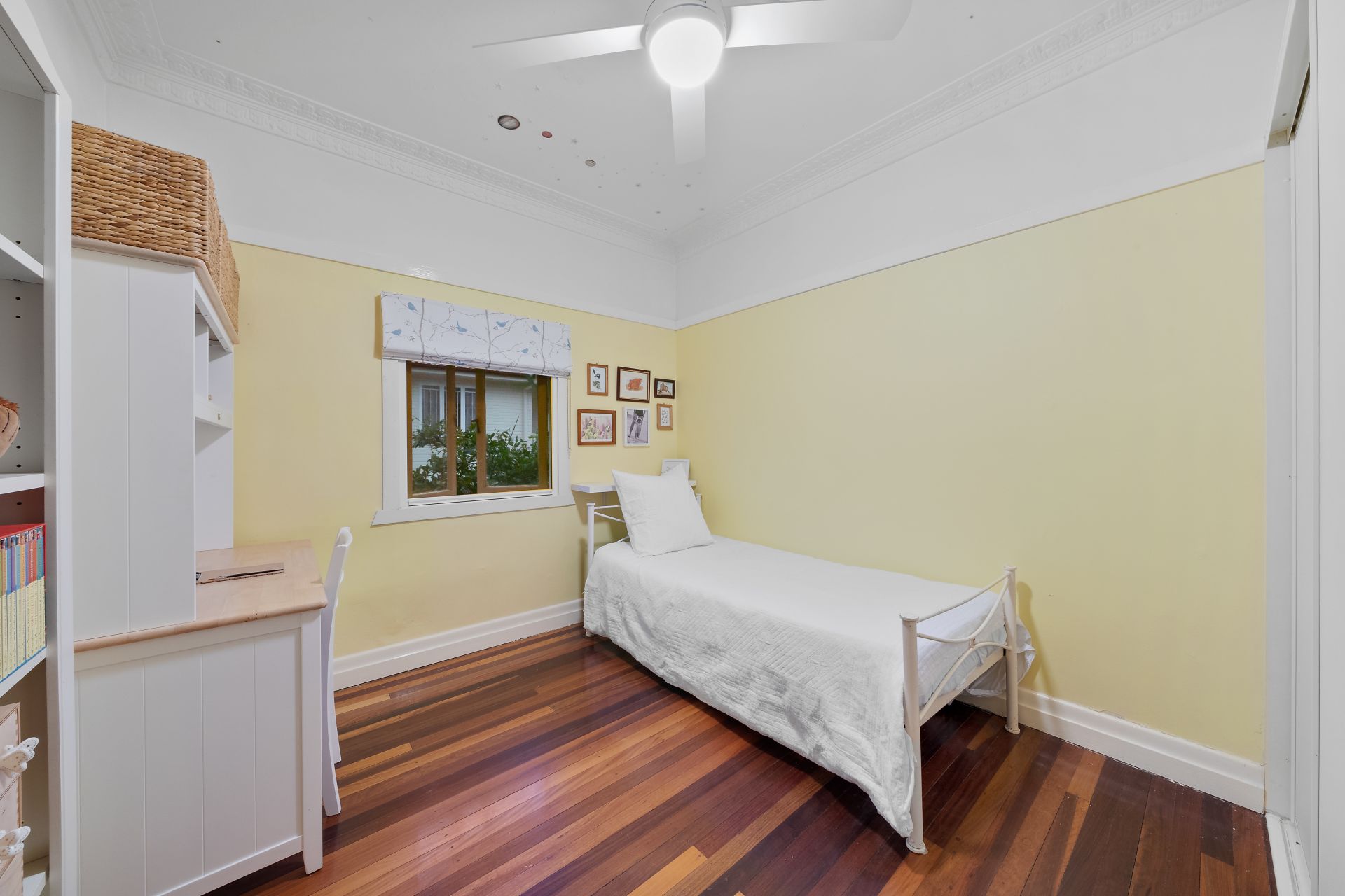 > Bedroom 3 located on the top level of the home features extra-high ceilings with ornate cornicing, ducted Mitsubishi air-conditioning, timber flooring, built-in-robe, ceiling fan, roller blind, retractable flyscreens and casement windows