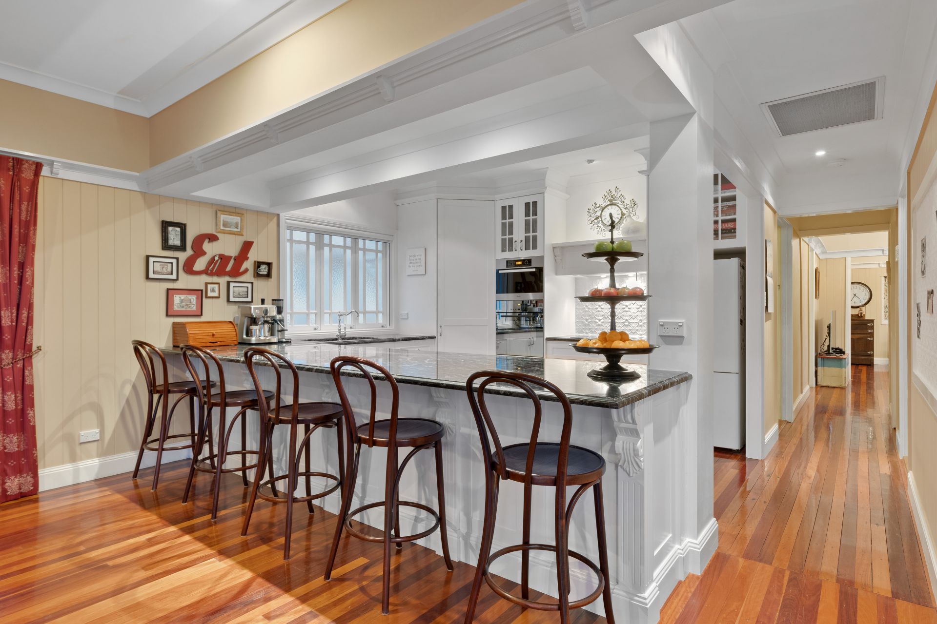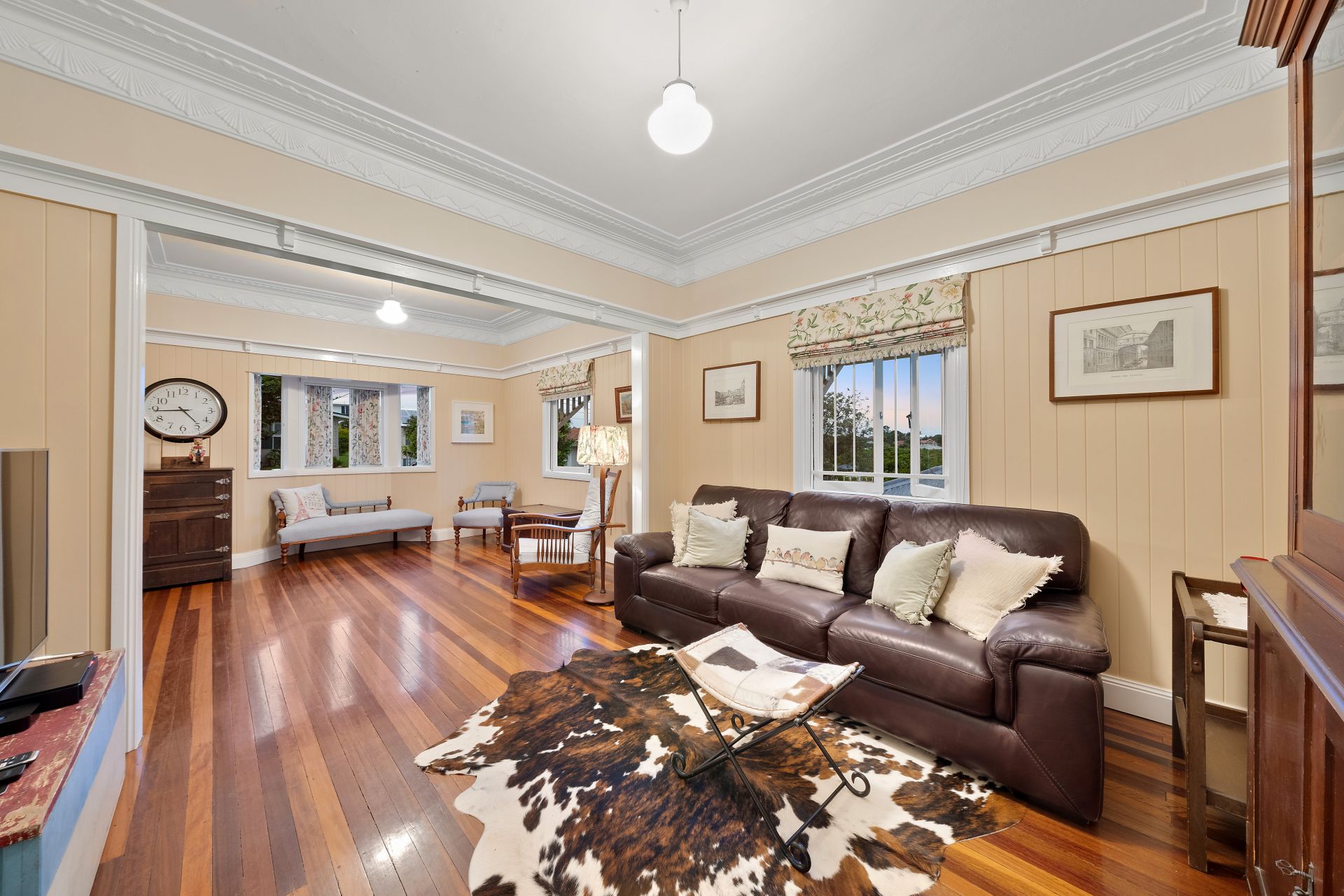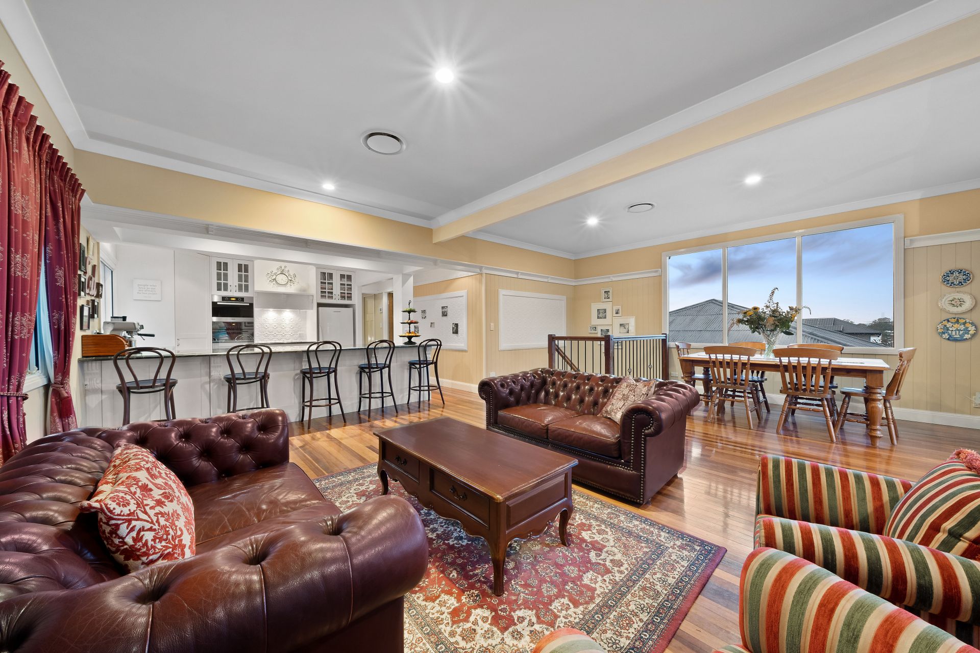 > The formal living/dining areas flow effortlessly to the open plan living/dining areas + kitchen. Boasting extra-high ceilings, ducted Mitsubishi air-conditioning, ornate cornicing + ceiling work, rich timber flooring, VJ walls, picture rails, combination of bay + casement windows, retractable fly screens, roman curtains and pendant lighting