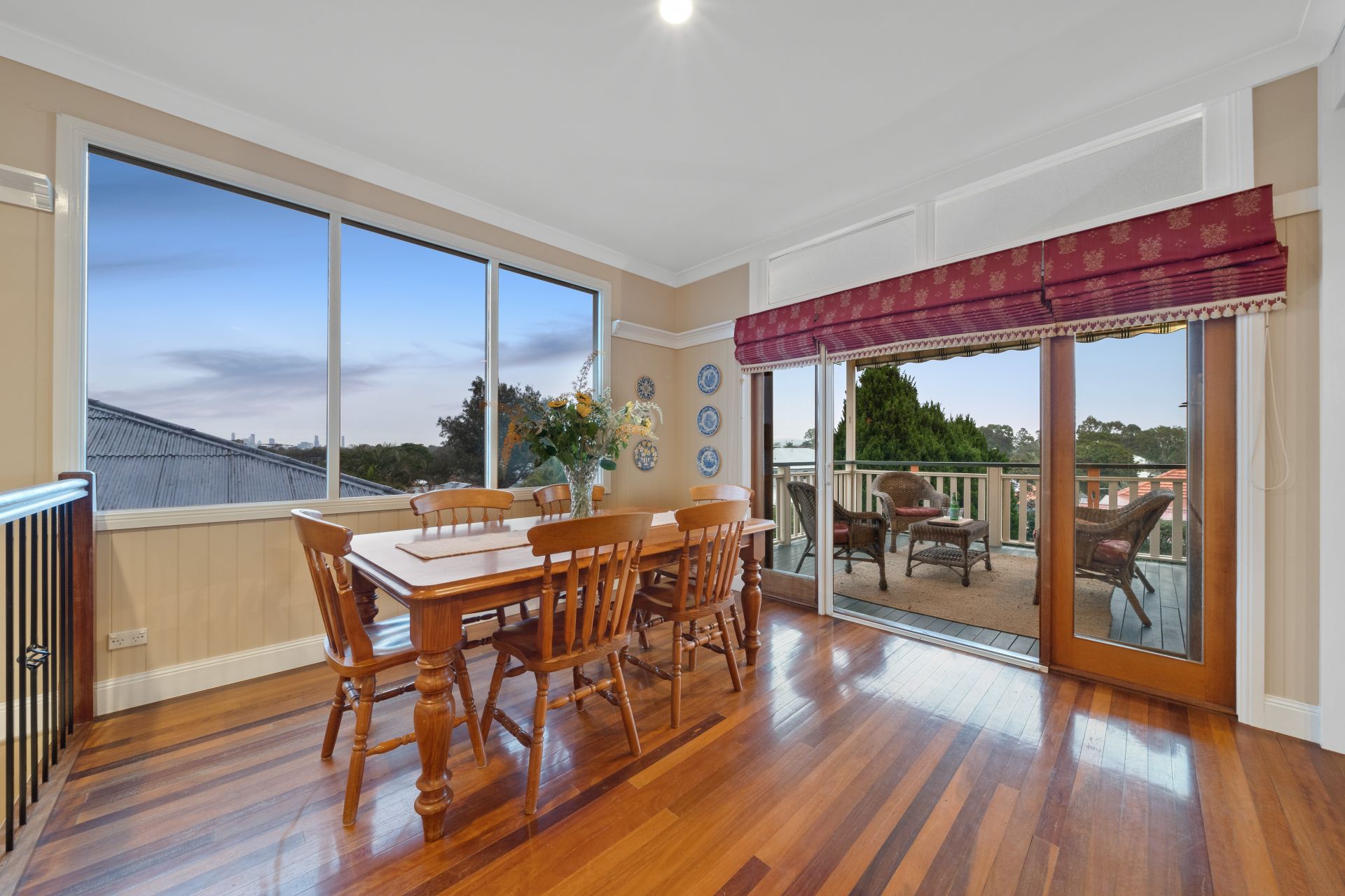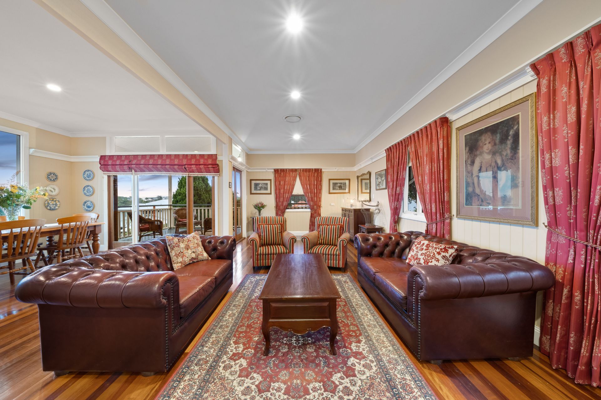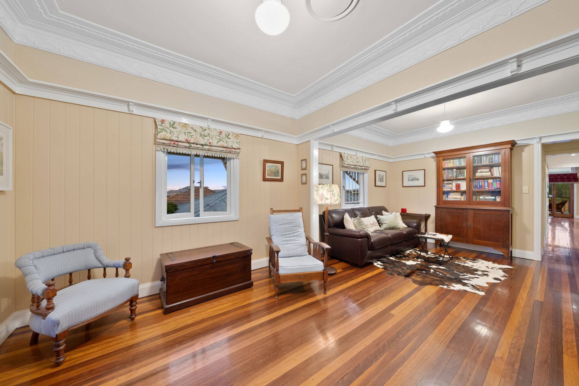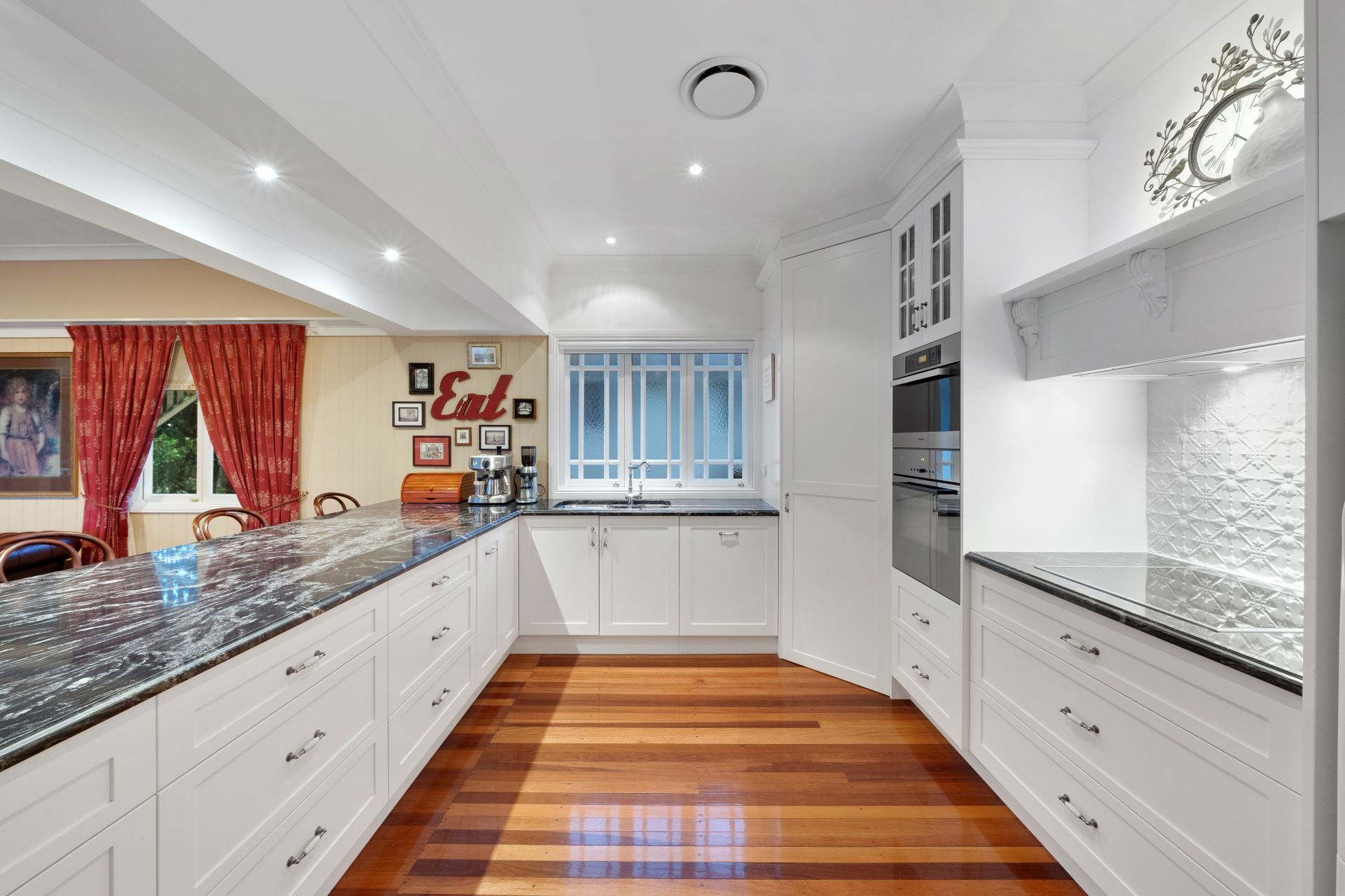> The formal living/dining areas flow effortlessly to the open plan living/dining areas + kitchen. Boasting extra-high ceilings, ducted Mitsubishi air-conditioning, ornate cornicing + ceiling work, rich timber flooring, VJ walls, picture rails, combination of bay + casement windows, retractable fly screens, roman curtains and pendant lighting