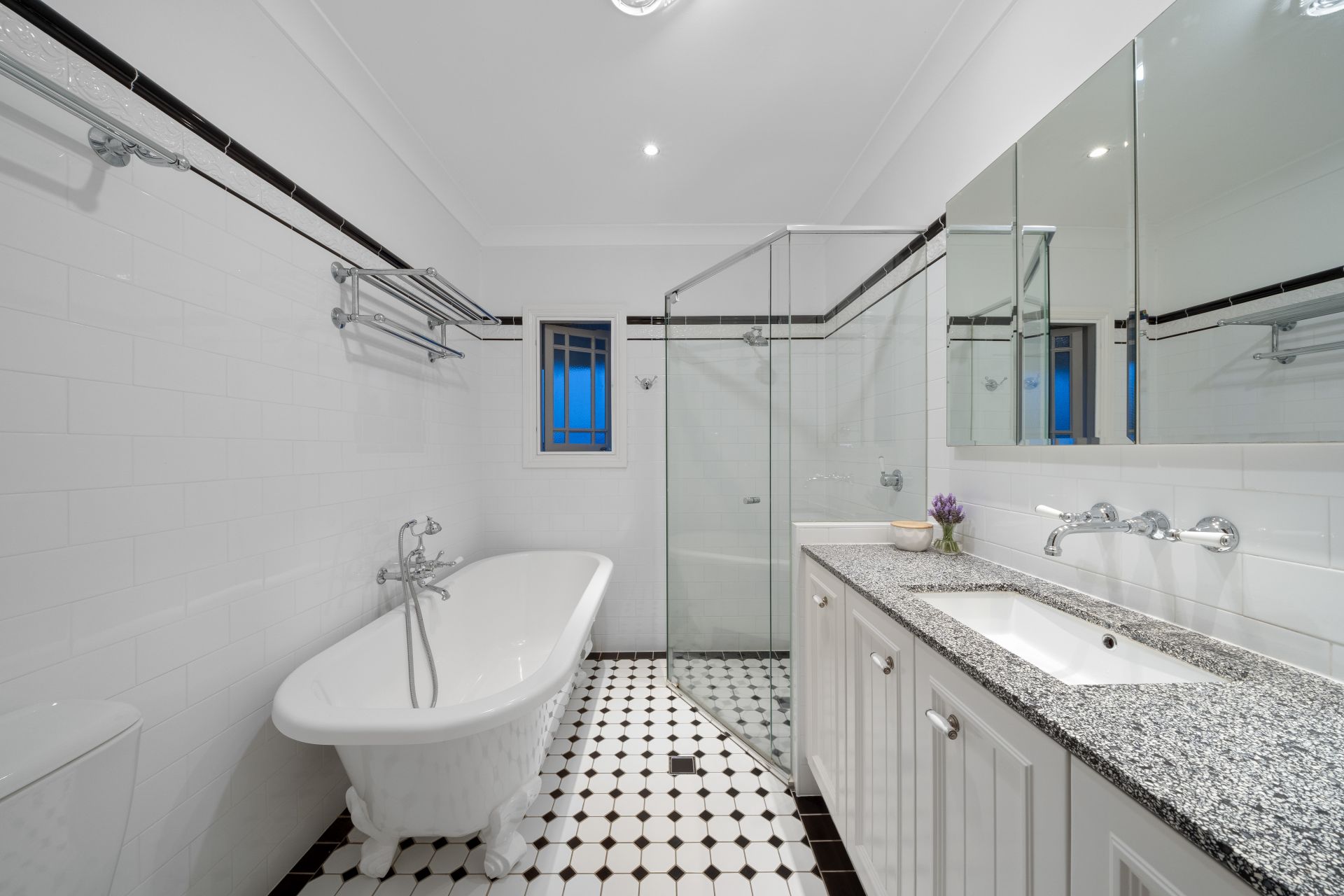 > The upstairs main bathroom features over-sized corner shower with free standing claw bath configuration, 20mm stone topped vanity with under mounted basin, dual mirror faced medicine cabinets, dual towel racks, towel hooks, hand towel racks, extra-high ceilings, heater/extractor/light combo, period style tapware, laundry chute and casement window