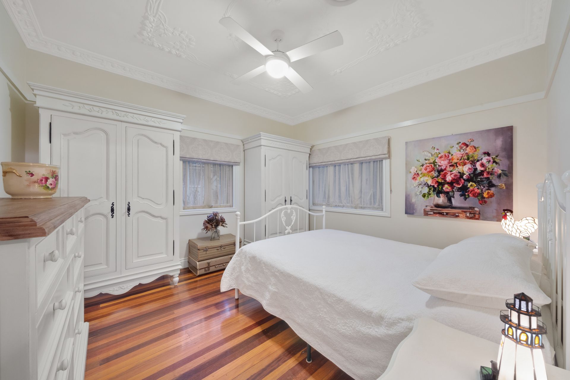 > Bedroom 2 located on the top level of the home features extra-high ceilings with ornate cornicing, ducted Mitsubishi air-conditioning, rich timber flooring, built-in-robe, ceiling fan, roman curtains, retractable flyscreens and casement windows
