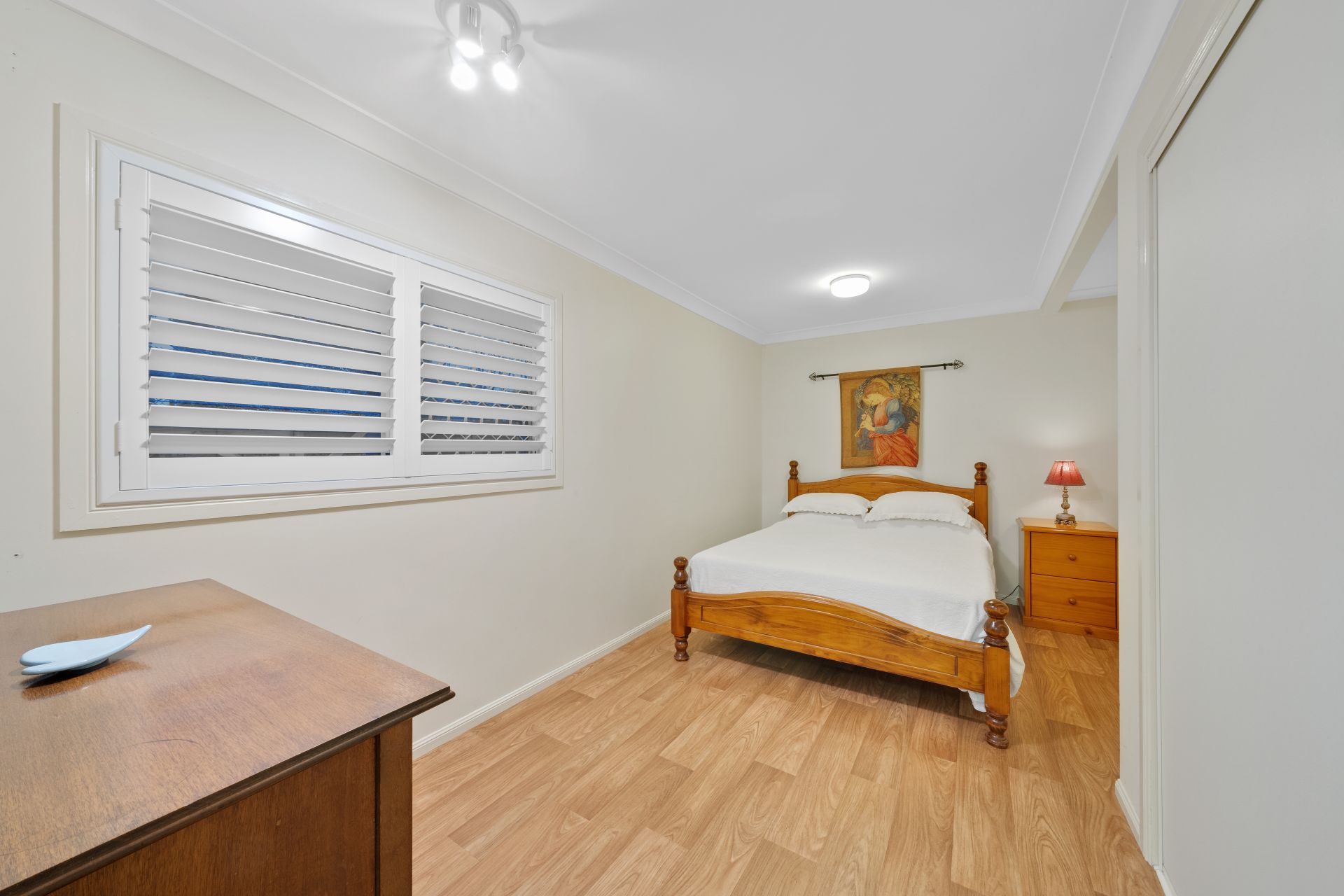 > Bedroom 4 located on the lower level of the home features access to the 2-way second bathroom, durable wood look flooring, combination of oyster + directional gallery lighting, built-in robe, modern sliding windows, security screens and plantation shutters