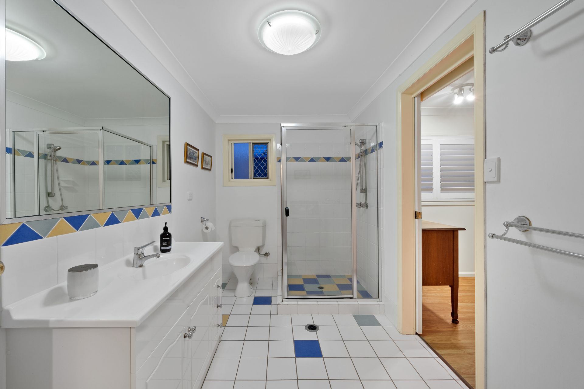 > The downstairs main bathroom features corner shower, single cast basin topped vanity with plenty of storage, framed vanity mirror, towel rack and toilet
