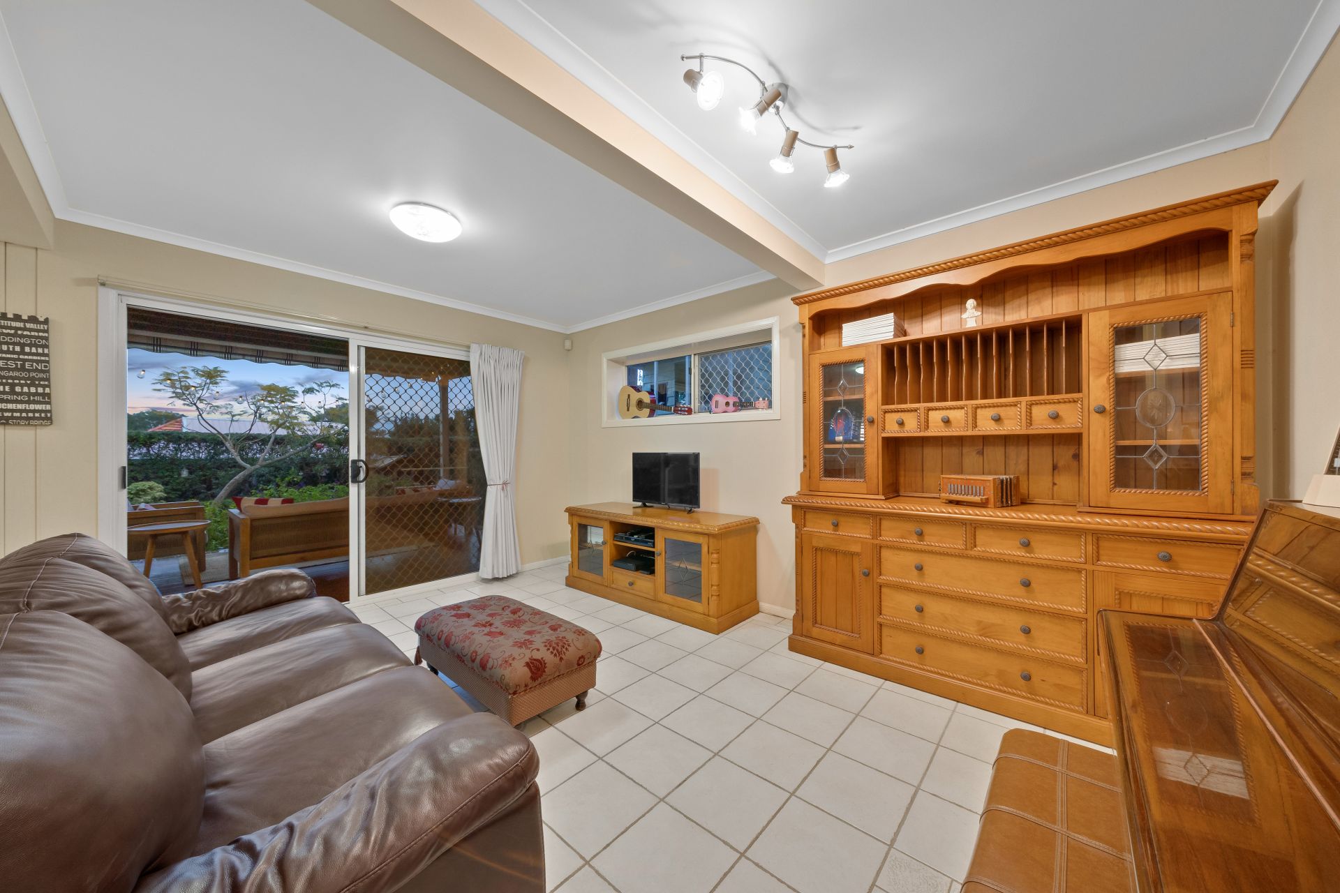 > The rumpus room located on the lower level of the home features tiled flooring, access to the lower level covered outdoor entertaining area + yard, combination of oyster + directional gallery lighting, under stairs storage and access to the second bathroom + bedroom 4