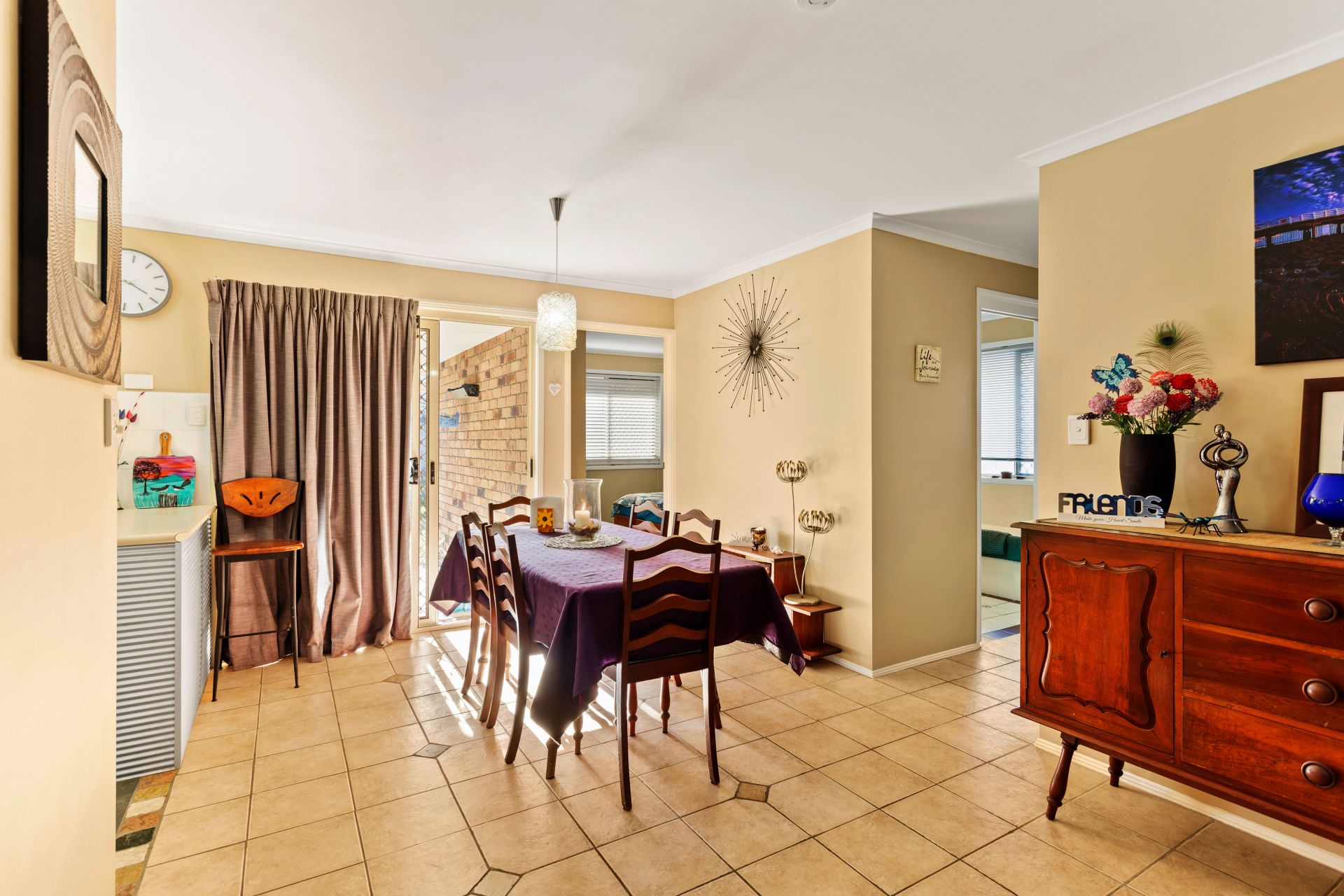 - Open living and dining area with tiled flooring