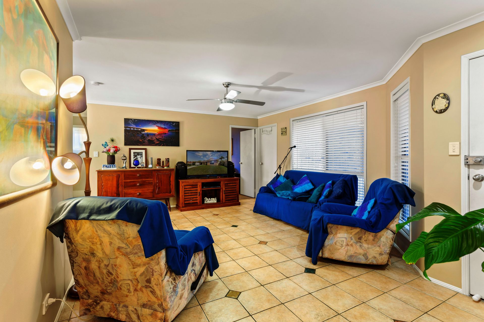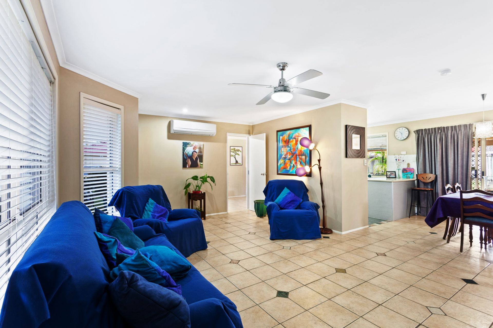 - Main living room with tiled flooring, ceiling fan and split-system air-conditioning