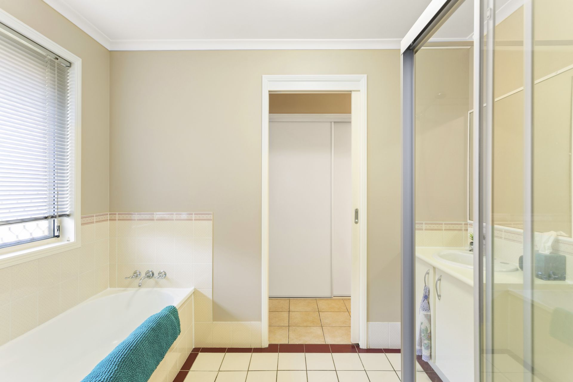 - Functional two-way bathroom with a separate bath, toilet and stainless-steel fittings
