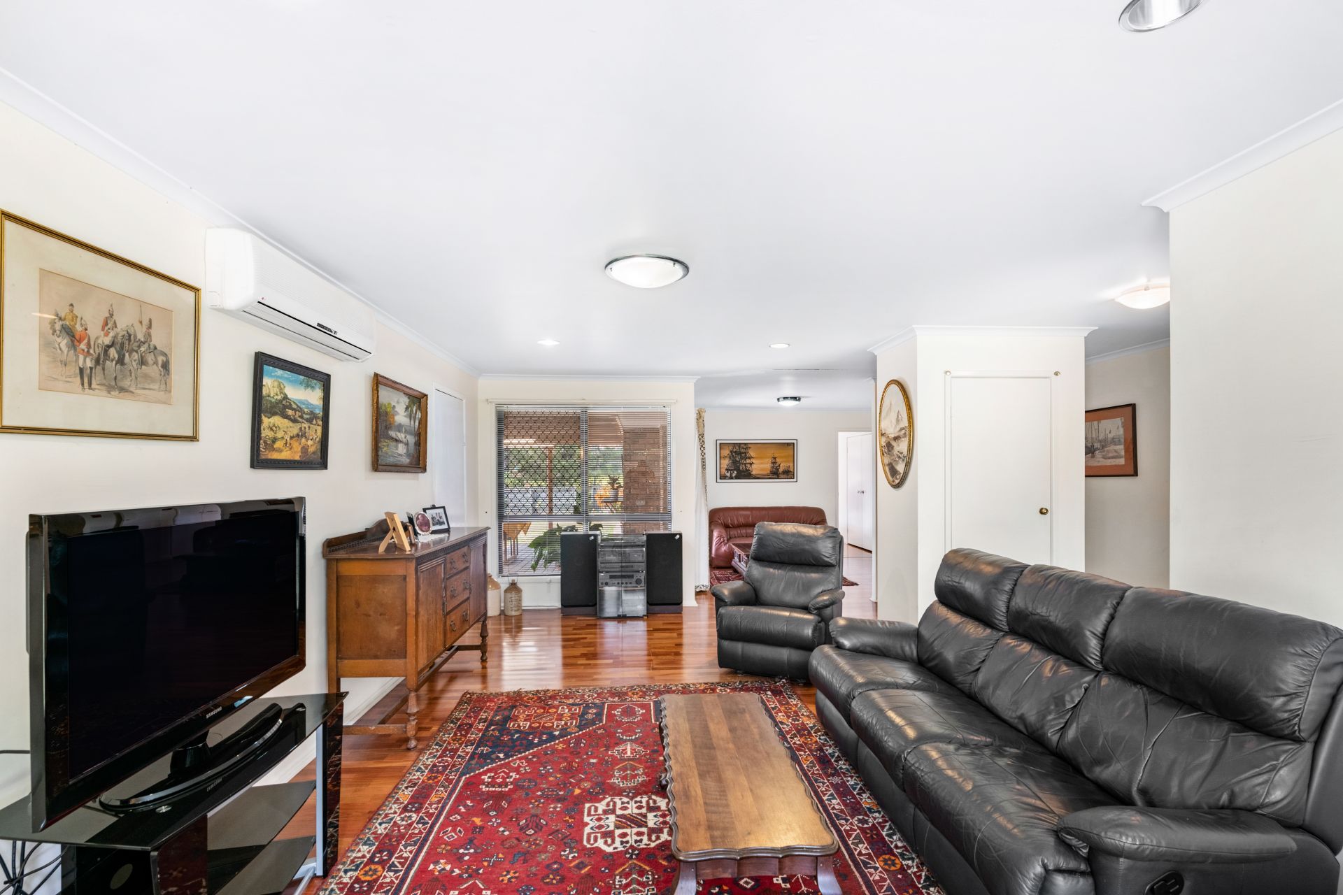 - Formal lounge and dining share a large combined area, enjoying views out over both the tree lined street and private back yard. Features include timber flooring, split system air-conditioning and access to the garage.
