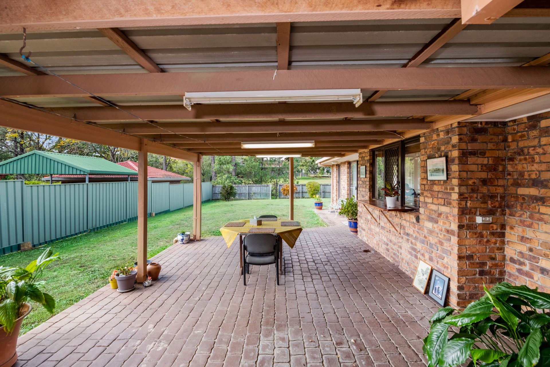 - Outdoor entertaining is available in spades. The covered entertaining area features lighting, outdoor power and servery from the kitchen, making it the perfect place to entertain guest while watching the kids play in the spacious back yard.