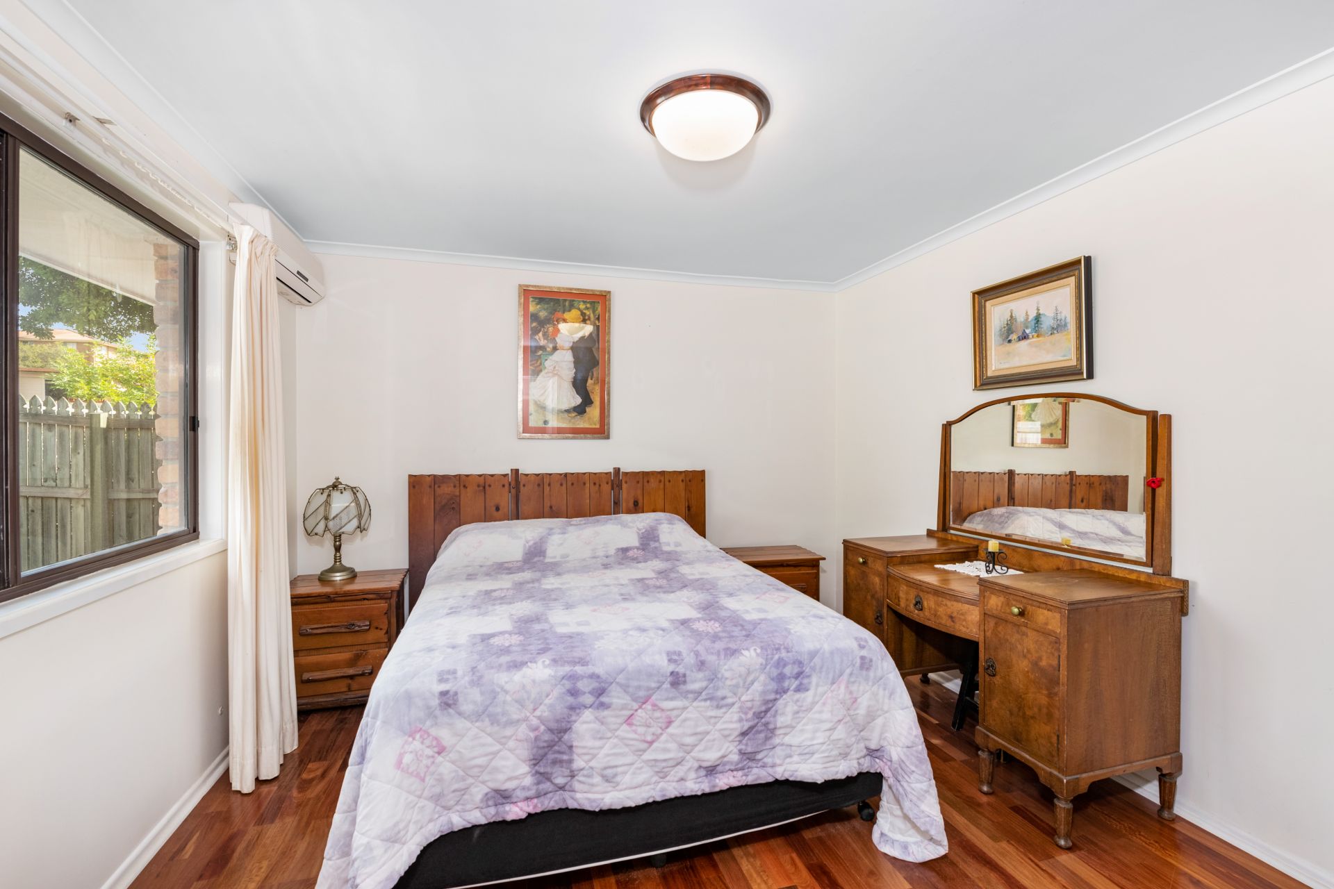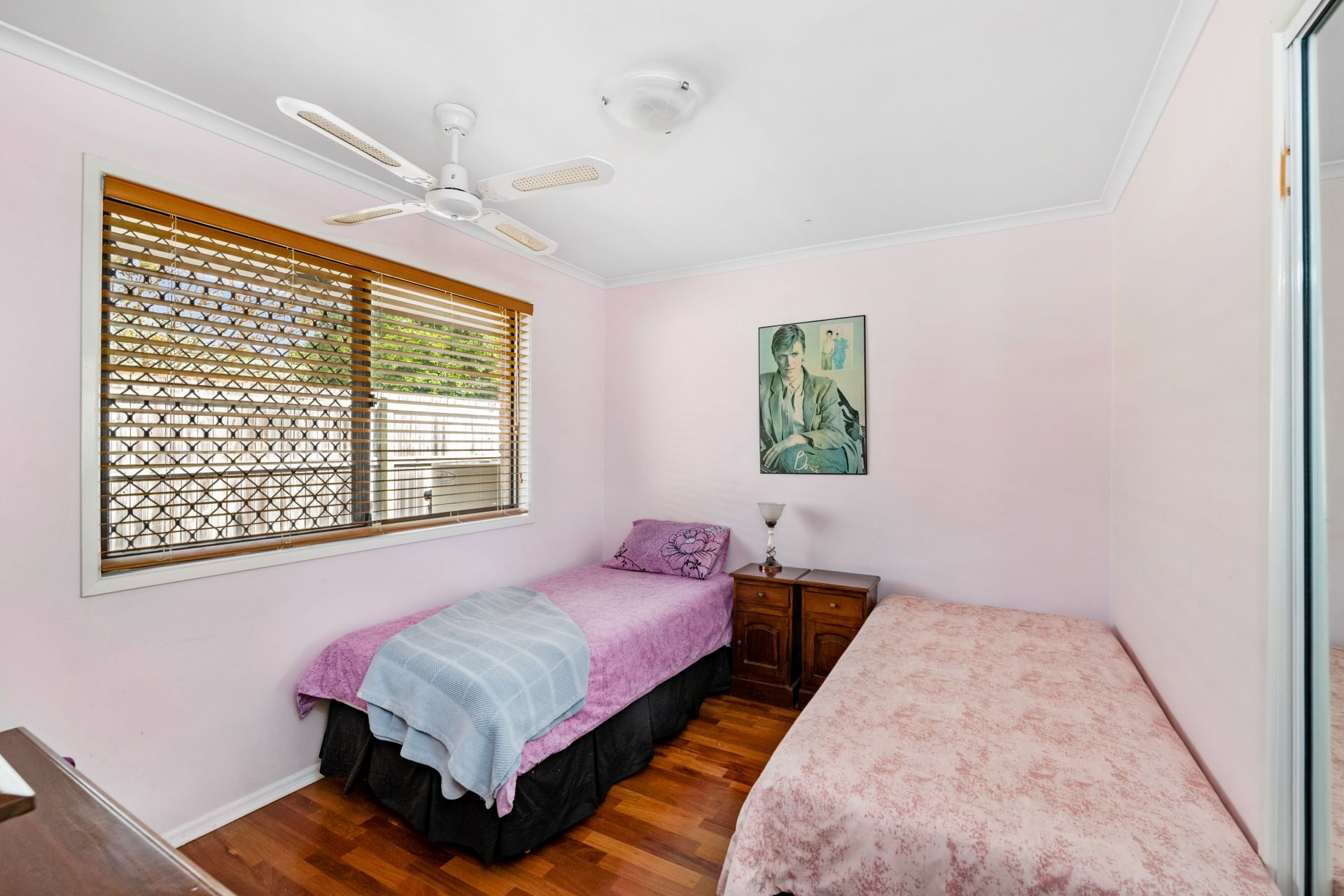 - Bedroom two looks out over the tree lined street and features timber flooring, ceiling fan and built-in-robe.