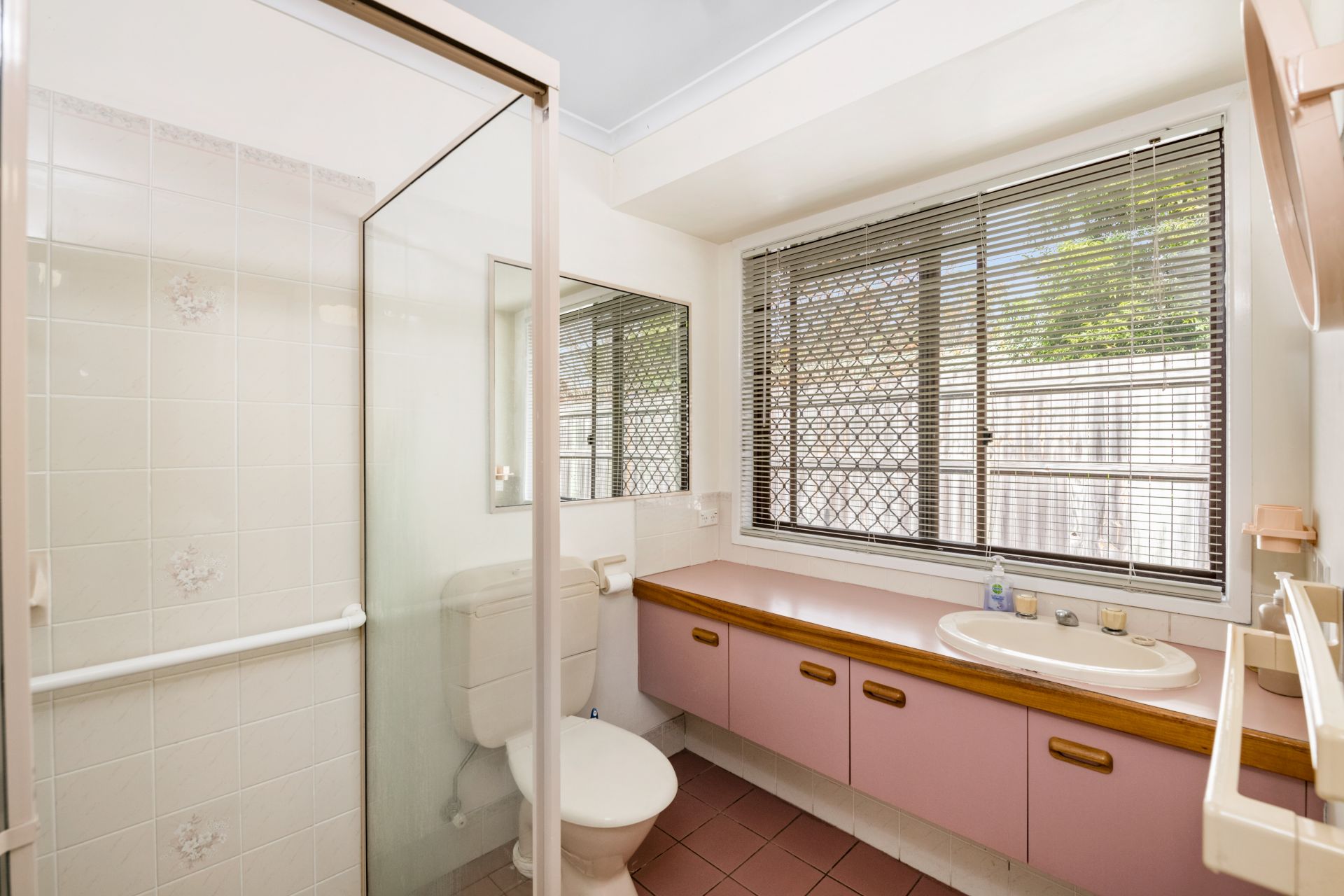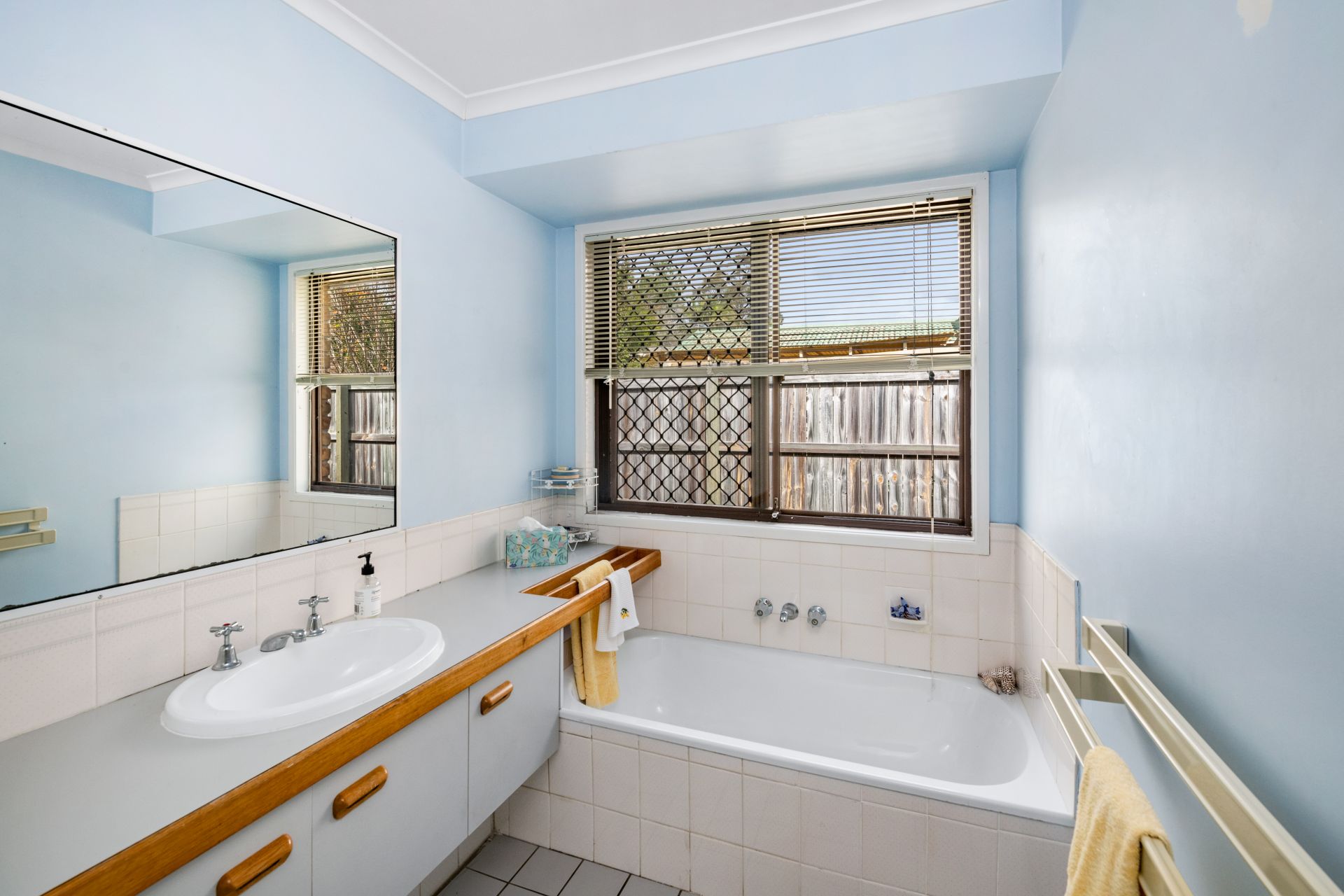 - Bathroom one is the home's main bathroom and features tiled flooring, shower, bath, single vanity with good bench space and separate toilet.