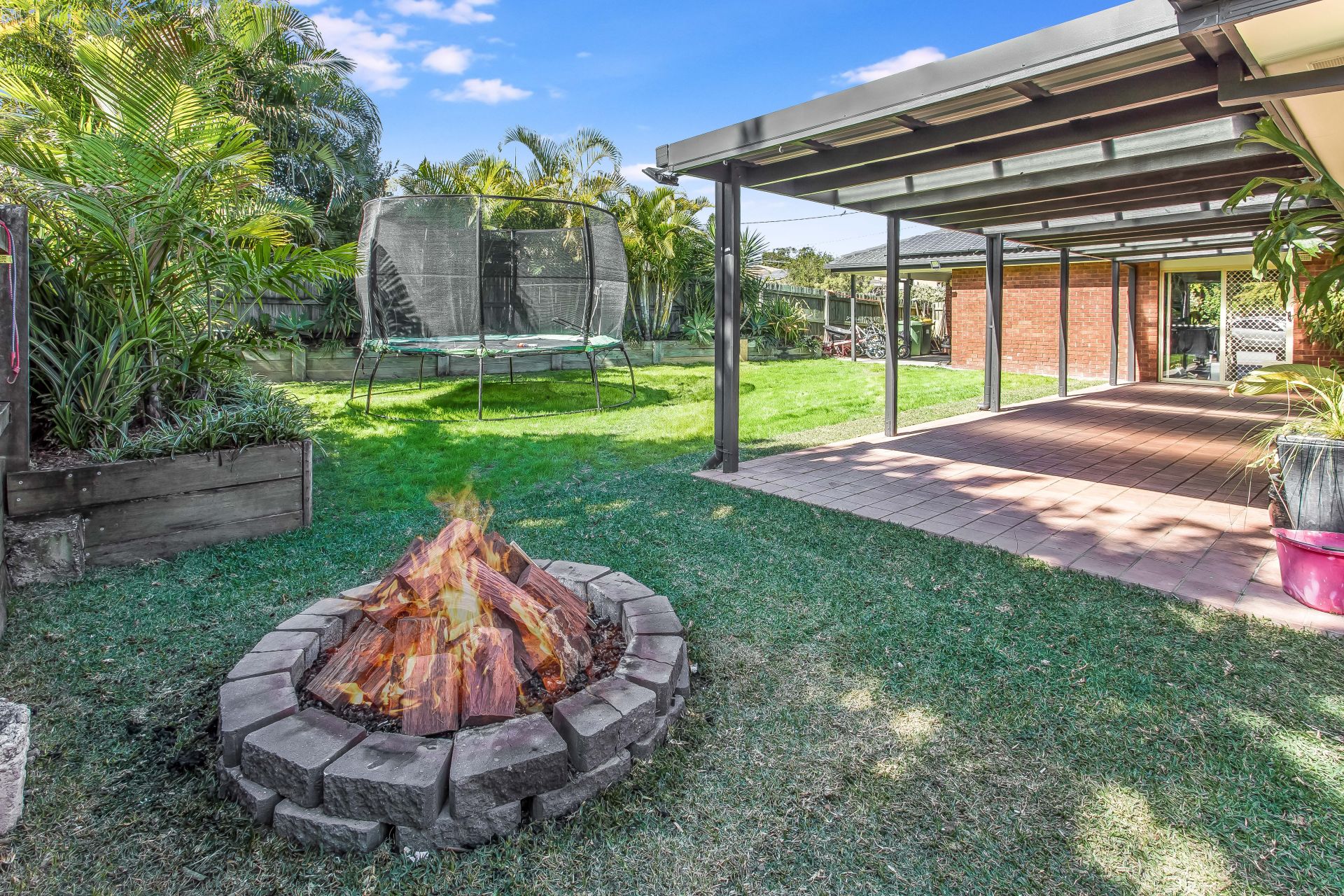 - Good-size backyard with freshly laid grass and beautifully landscaped gardens