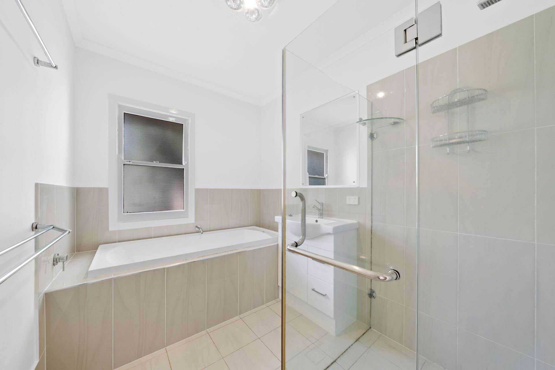 - The renovated bathroom is centrally located with shower and a bath plus single vanity and the toilet is separate.