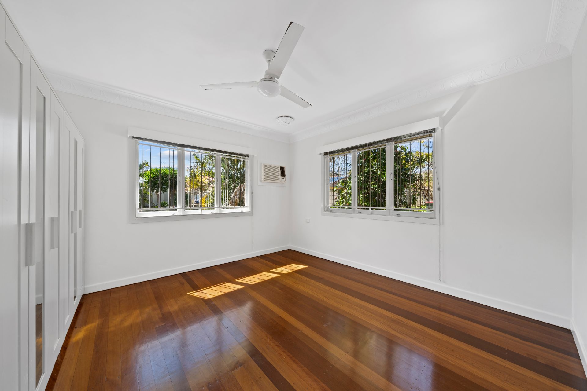 > Master bedroom with polished timber floors, ceiling fan, air-conditioning and built-in wardrobe
