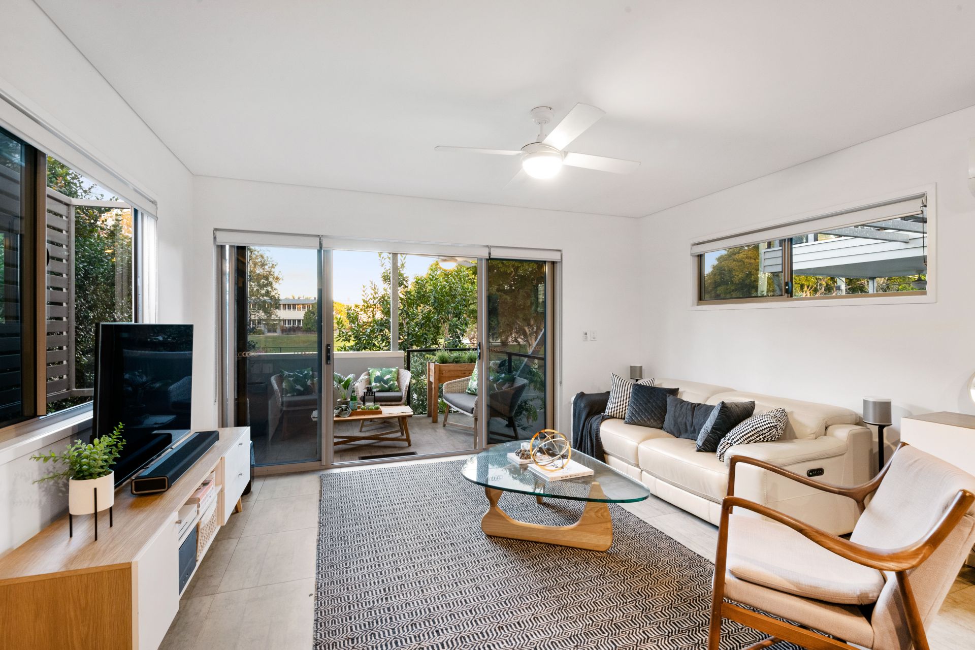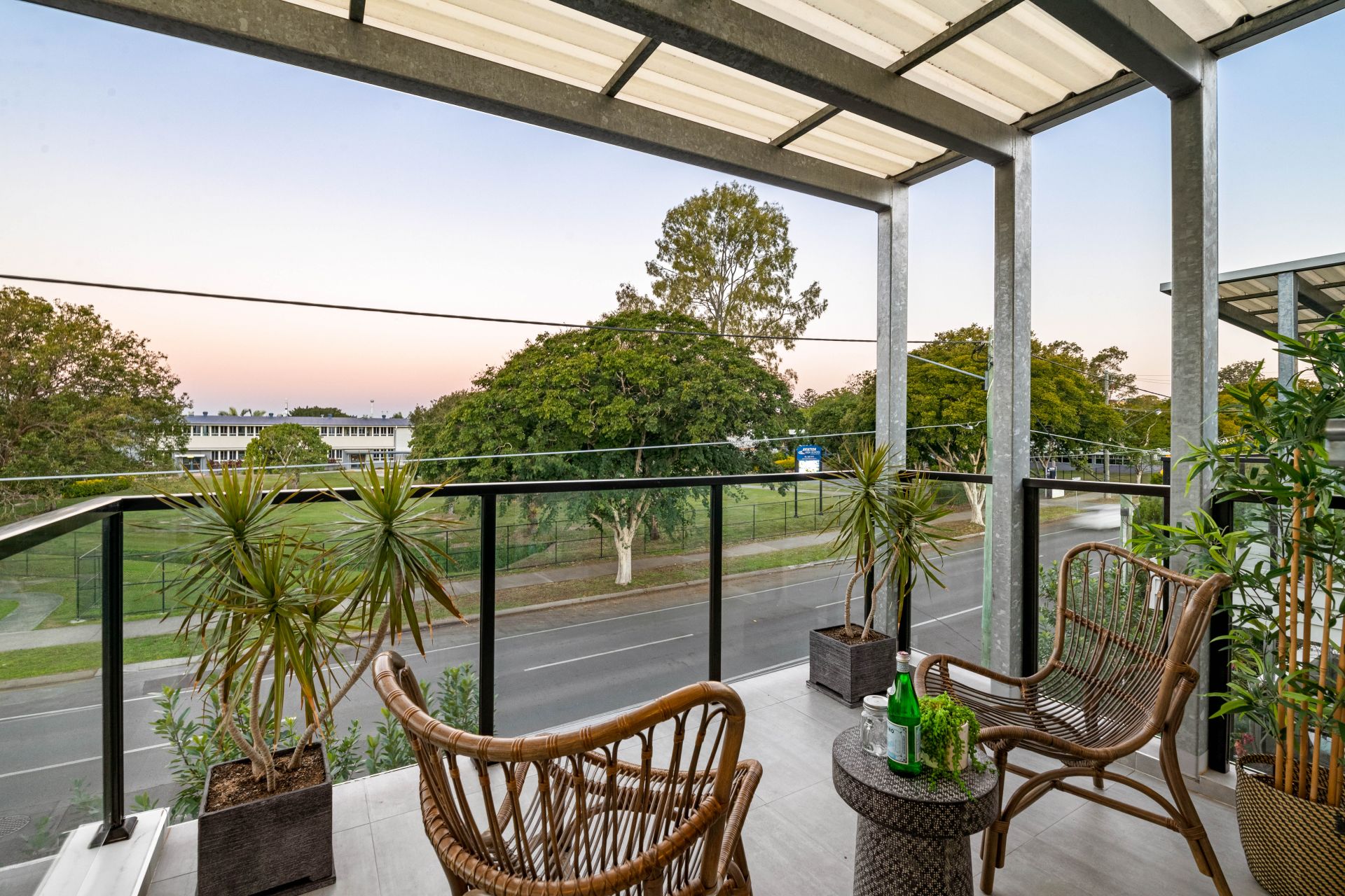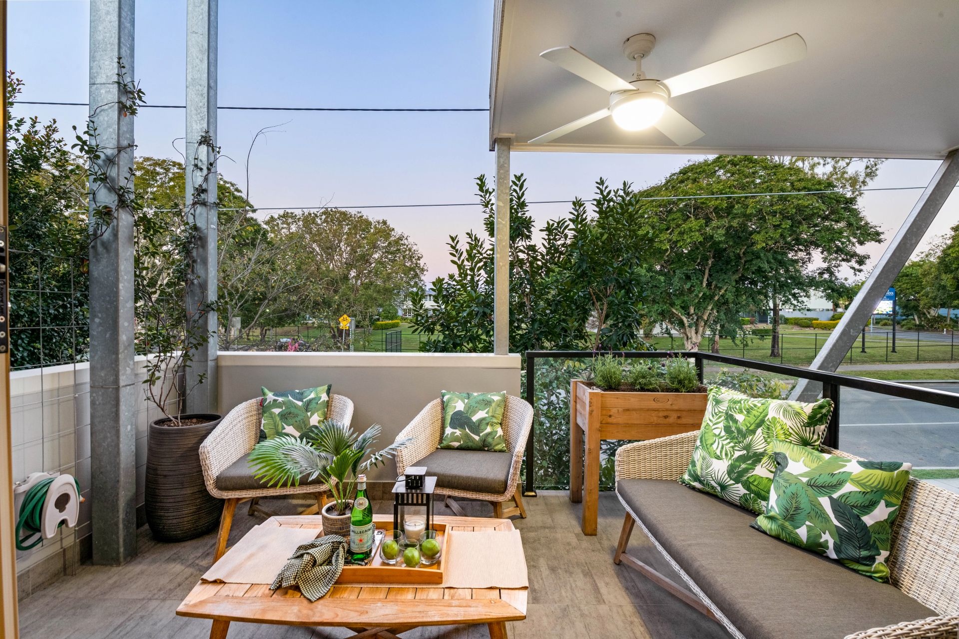 - Outdoor entertaining comes in the form of a covered private balcony off the home's living room and overlooking the beautiful tree-lined street. Features include lighting, ceiling fan and water tap.