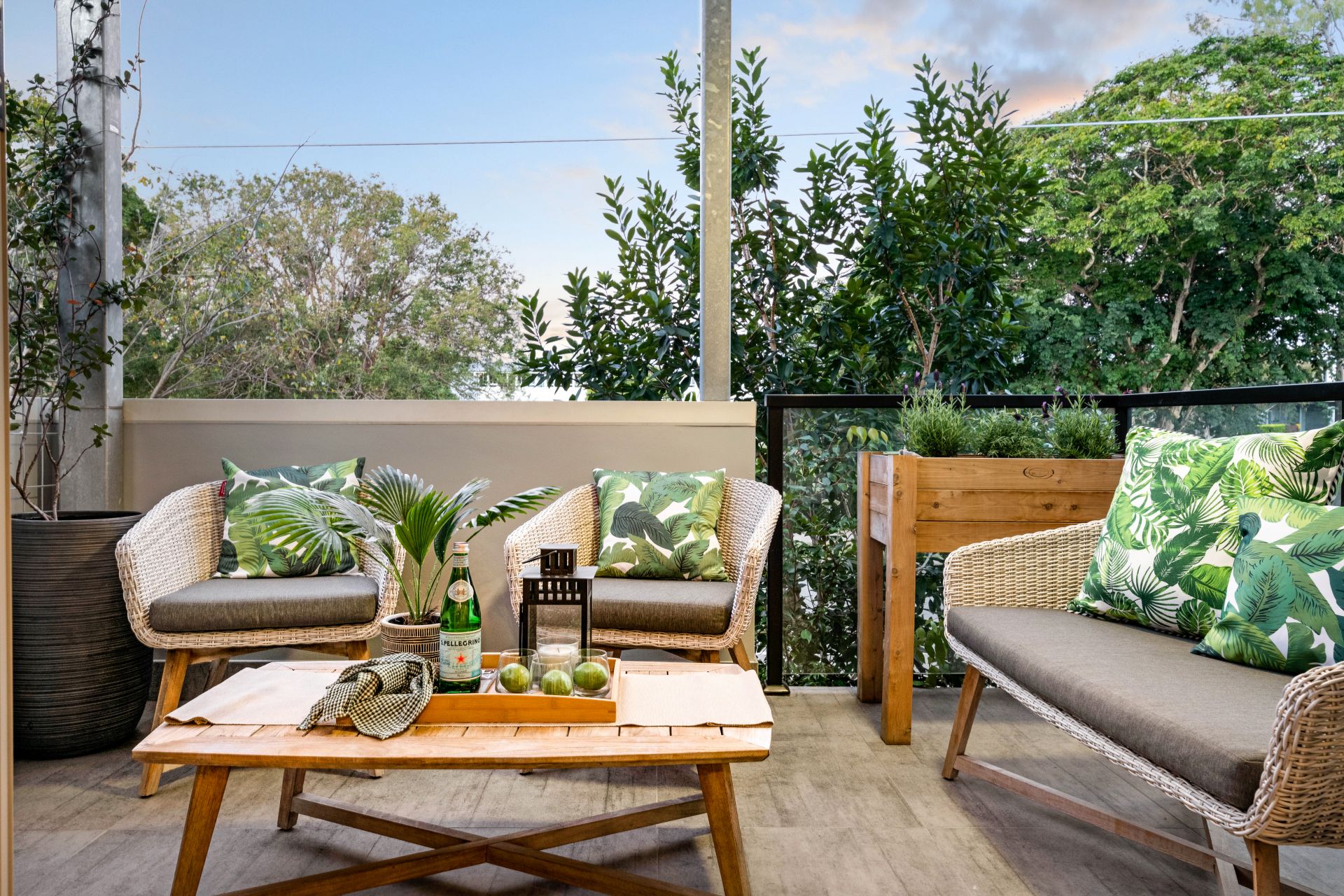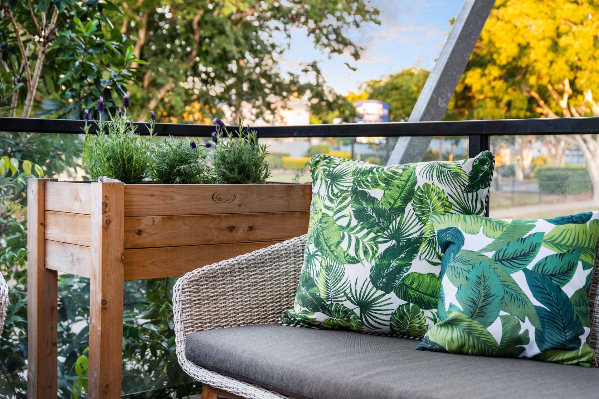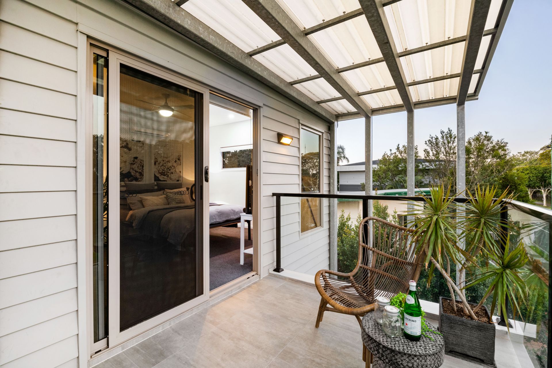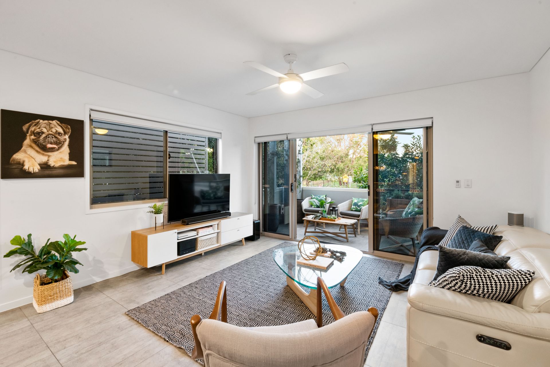 - Outdoor entertaining comes in the form of a covered private balcony off the home's living room and overlooking the beautiful tree-lined street. Features include lighting, ceiling fan and water tap.