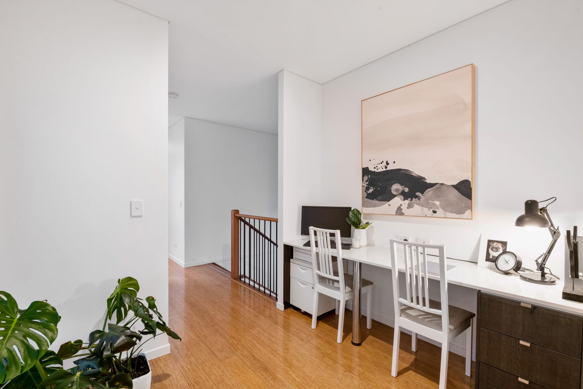 - Study area/home office is located upstairs and features built-in desk with stone benchtop and drawers.