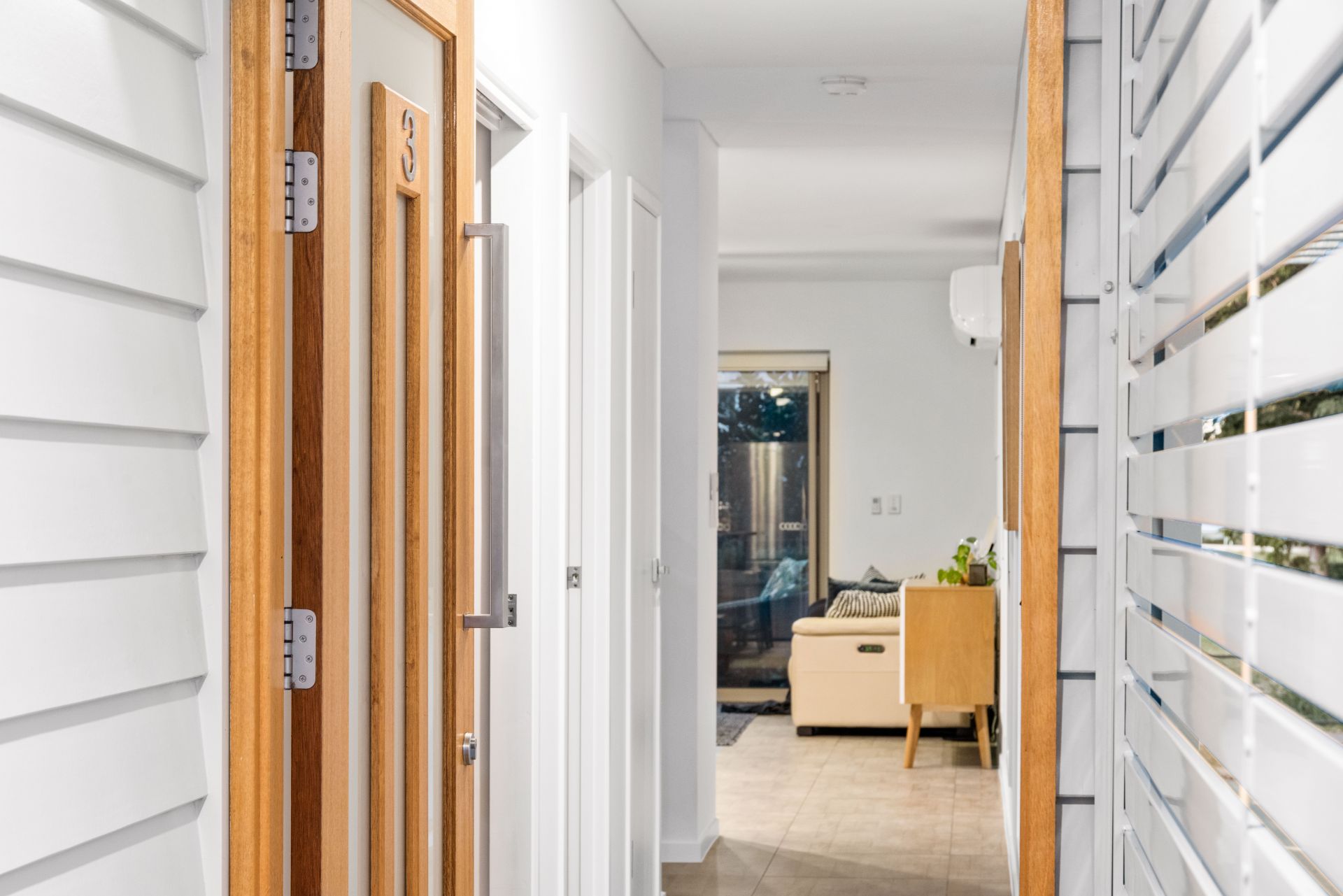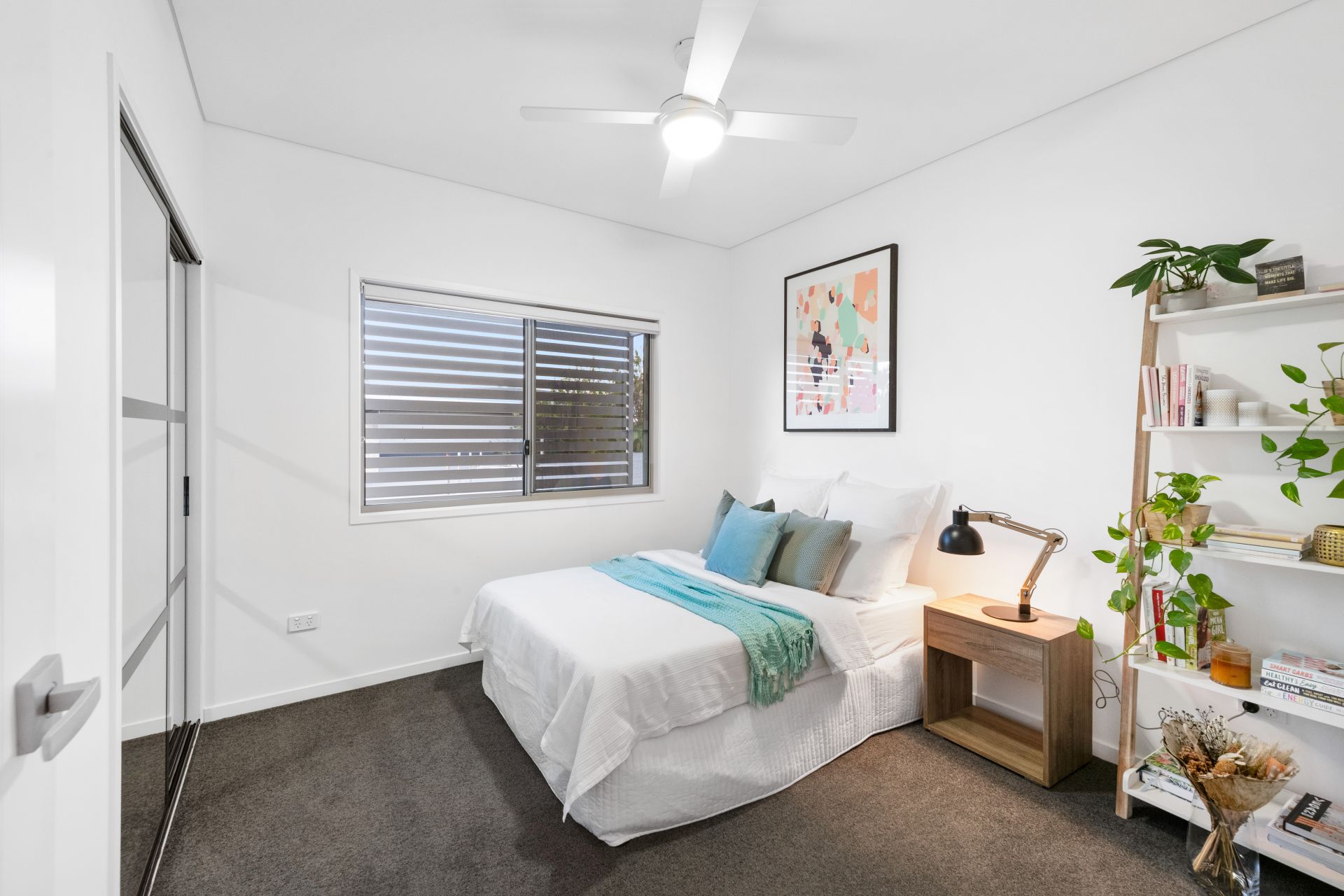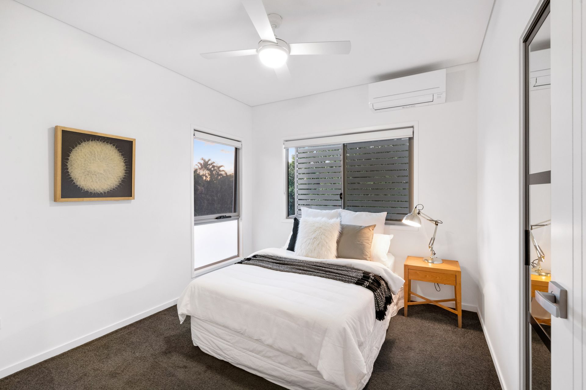 - Bedroom three, another great size room features carpeted flooring, split system air-conditioning, ceiling fan, built-in-robe with mirrored doors and roll-down blinds.