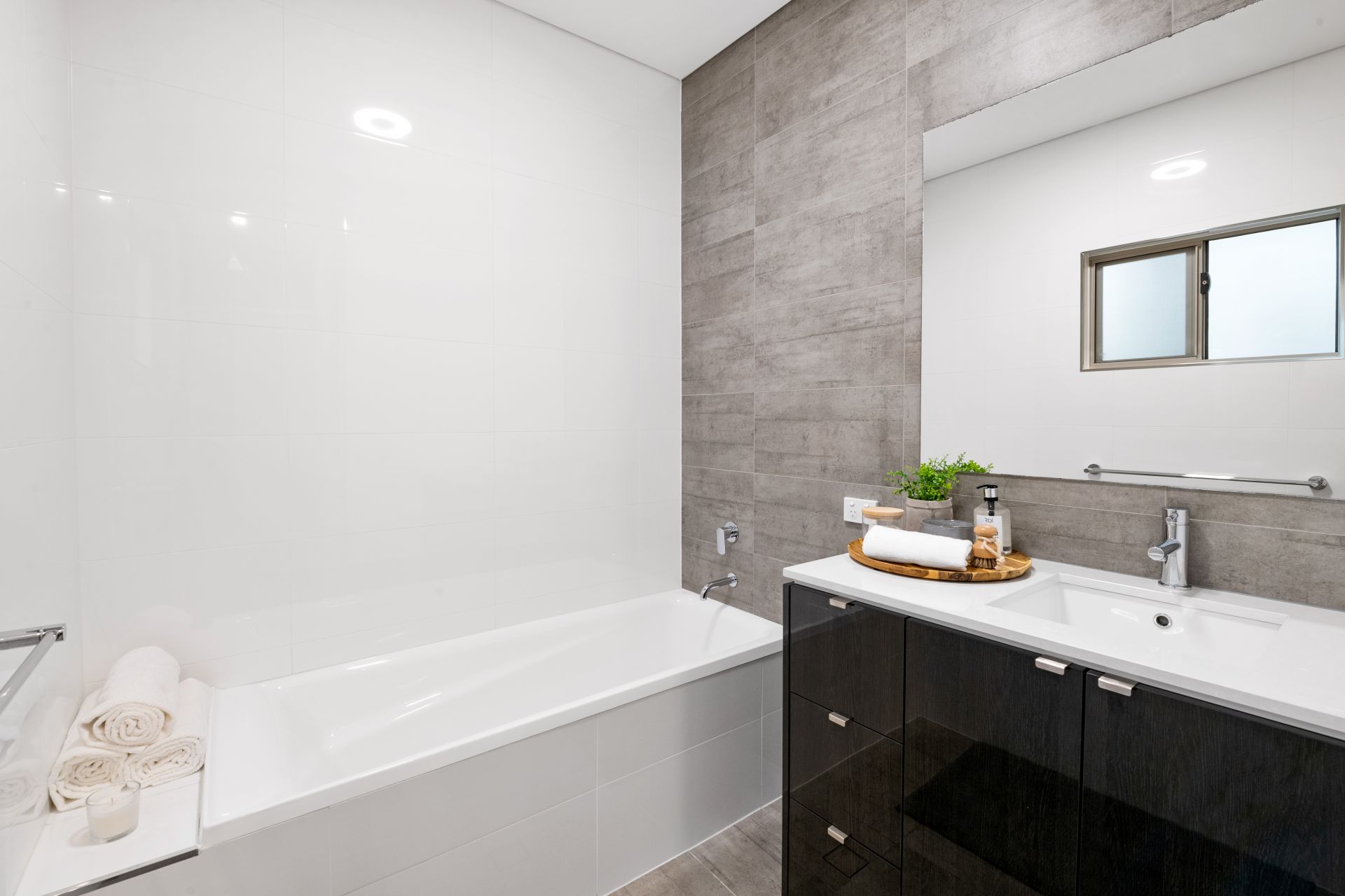 - Bathroom one is the home's main bathroom and features tiled flooring, shower, deep-soaker bath, single vanity with stone benchtop, floor-ceiling tiles and separate toilet.