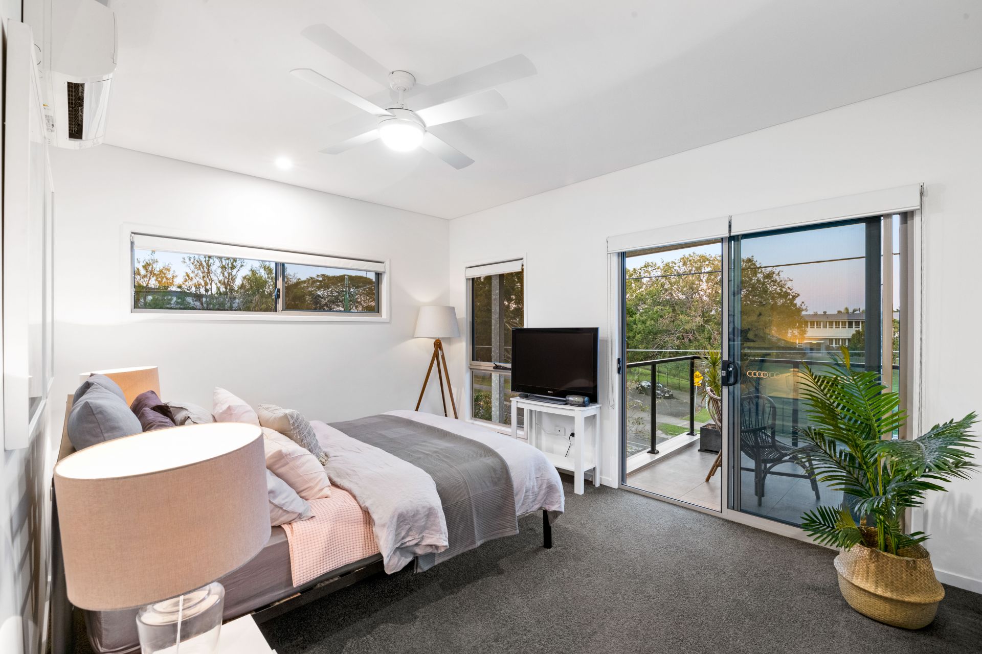 - Bedroom one is the home's spacious master bedroom with its own private balcony overlooking the tree lined street. This room features carpeted flooring, split system air-conditioning, ceiling fan, ensuite, spacious walk-in-robe and roll-down blinds.