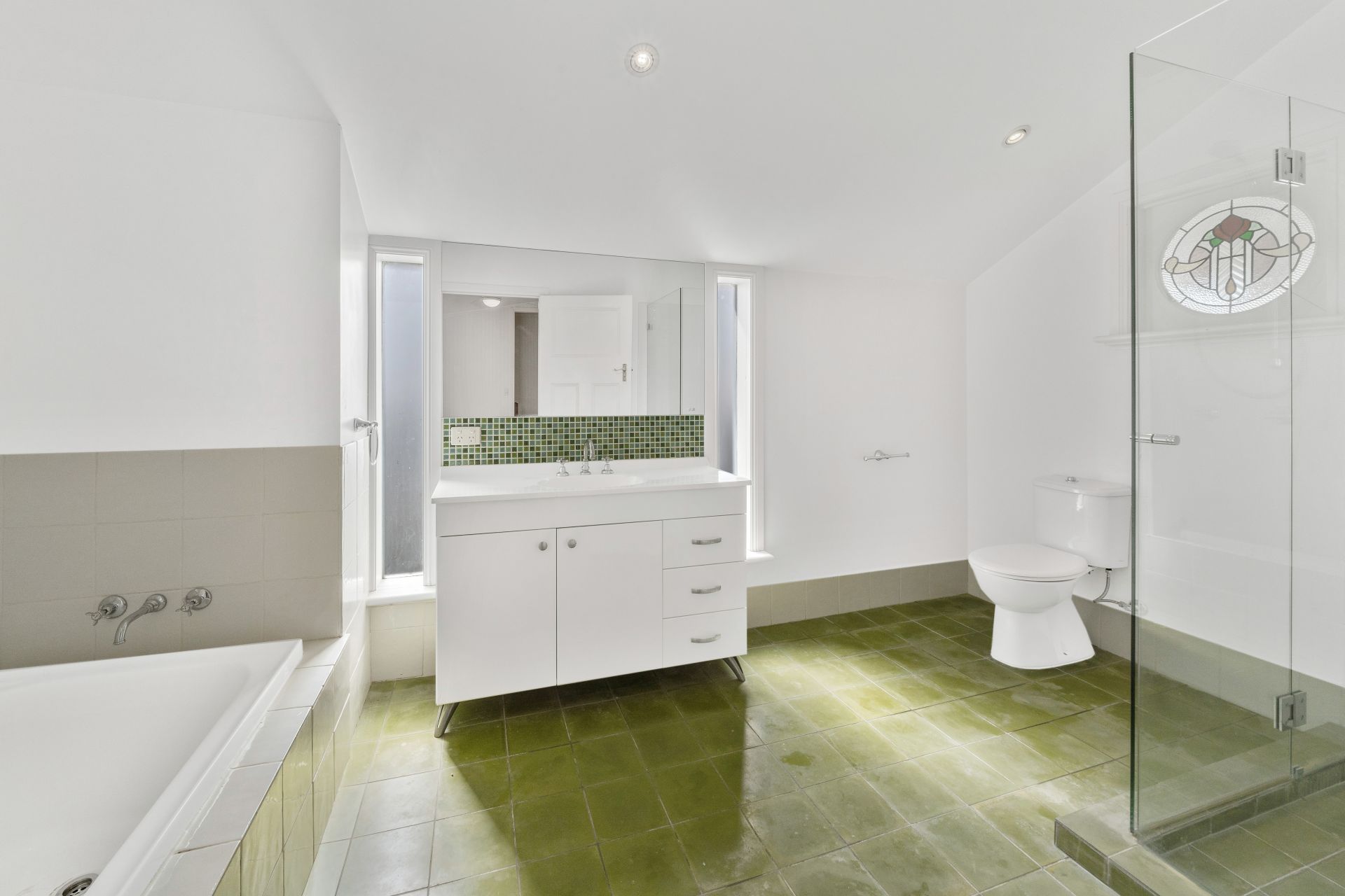 > The main bathroom is light-filled offers glass and chrome shower, separate bath, vanity, vanity mirror plus toilet