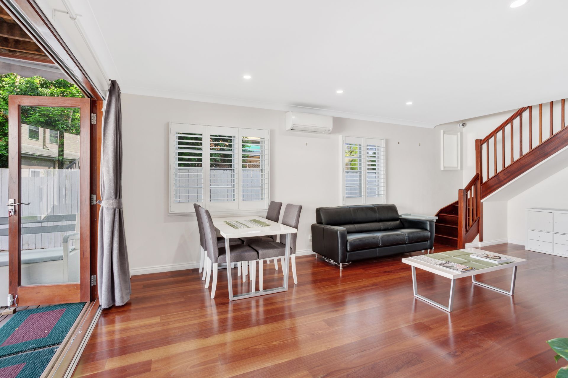 > Located on the top level of the home is the open plan living/dining area that flows to the kitchen and out to one of the incredible outdoor entertaining areas. The extra-high ceilings add to the expansive nature of this home. Featuring rich wood flooring, air-conditioning, LED down-lighting, skylight, ceiling fan, a recessed space that could be used as a study nook and a combination of French doors and casement windows