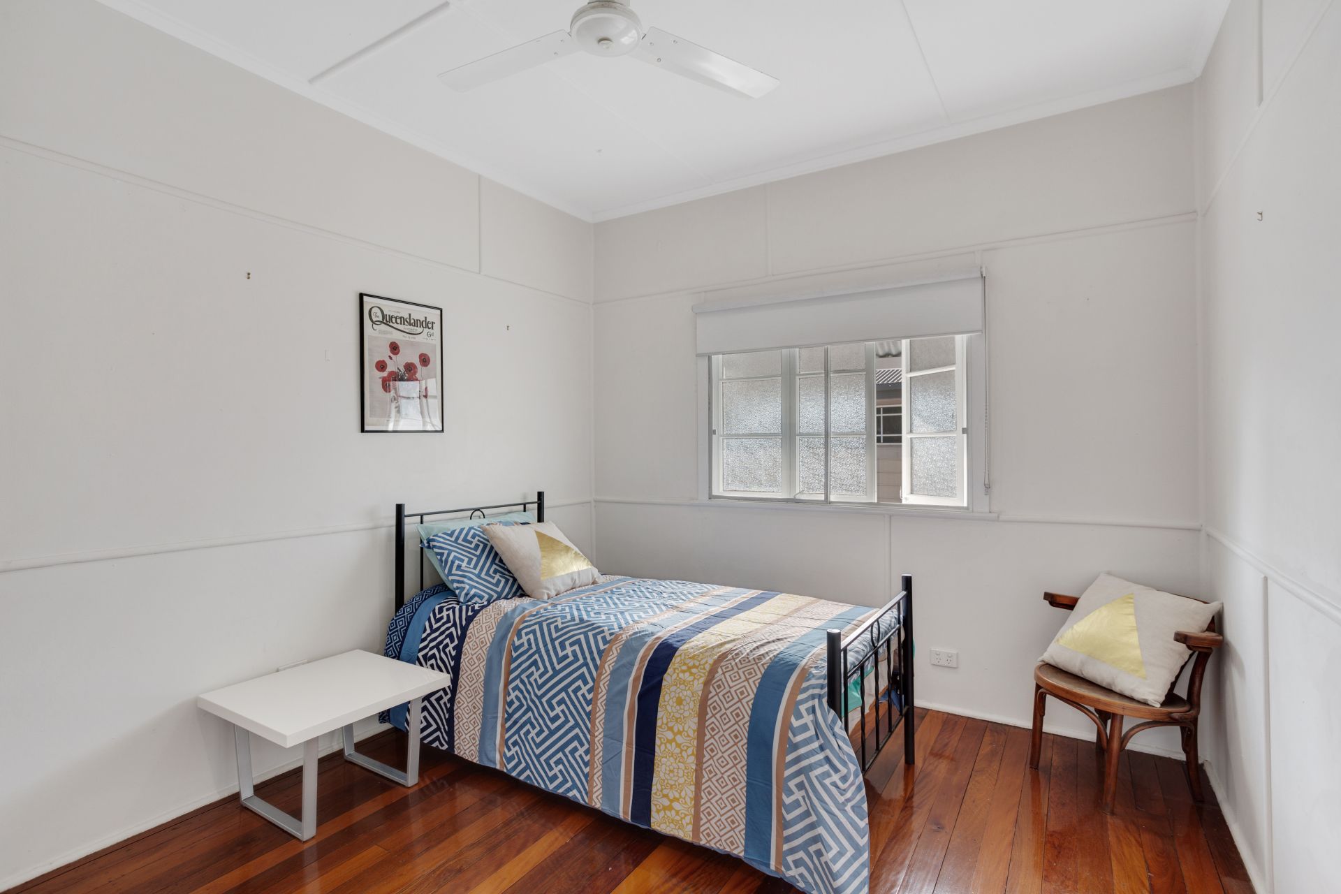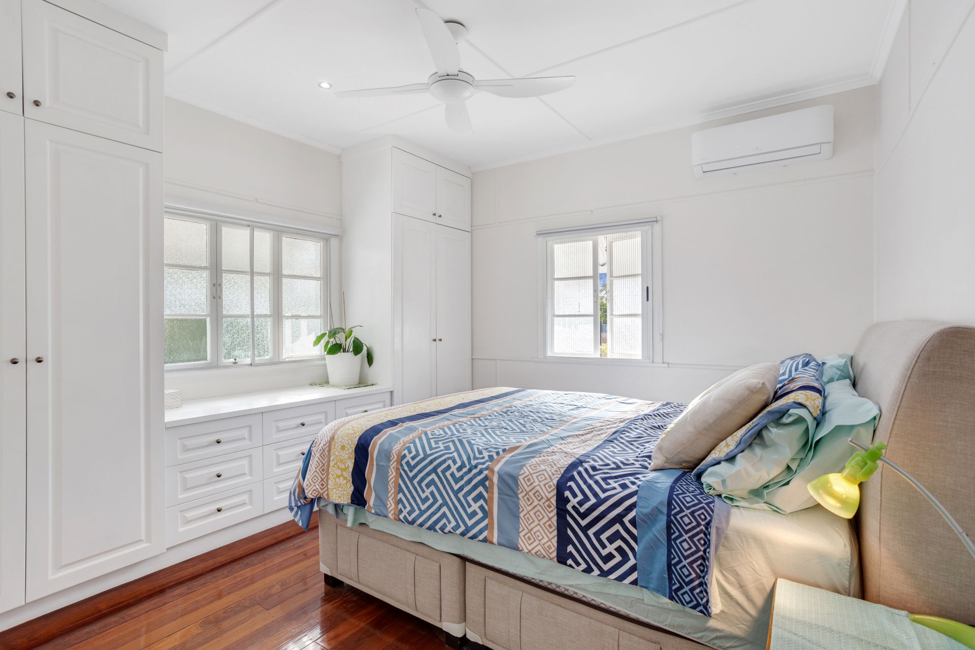 > Located on the top level of the home is bedroom 3 boasting air-conditioning, extra-high ceilings, rich timber flooring, built-in-robes, ceiling fan and casement windows with roller blinds