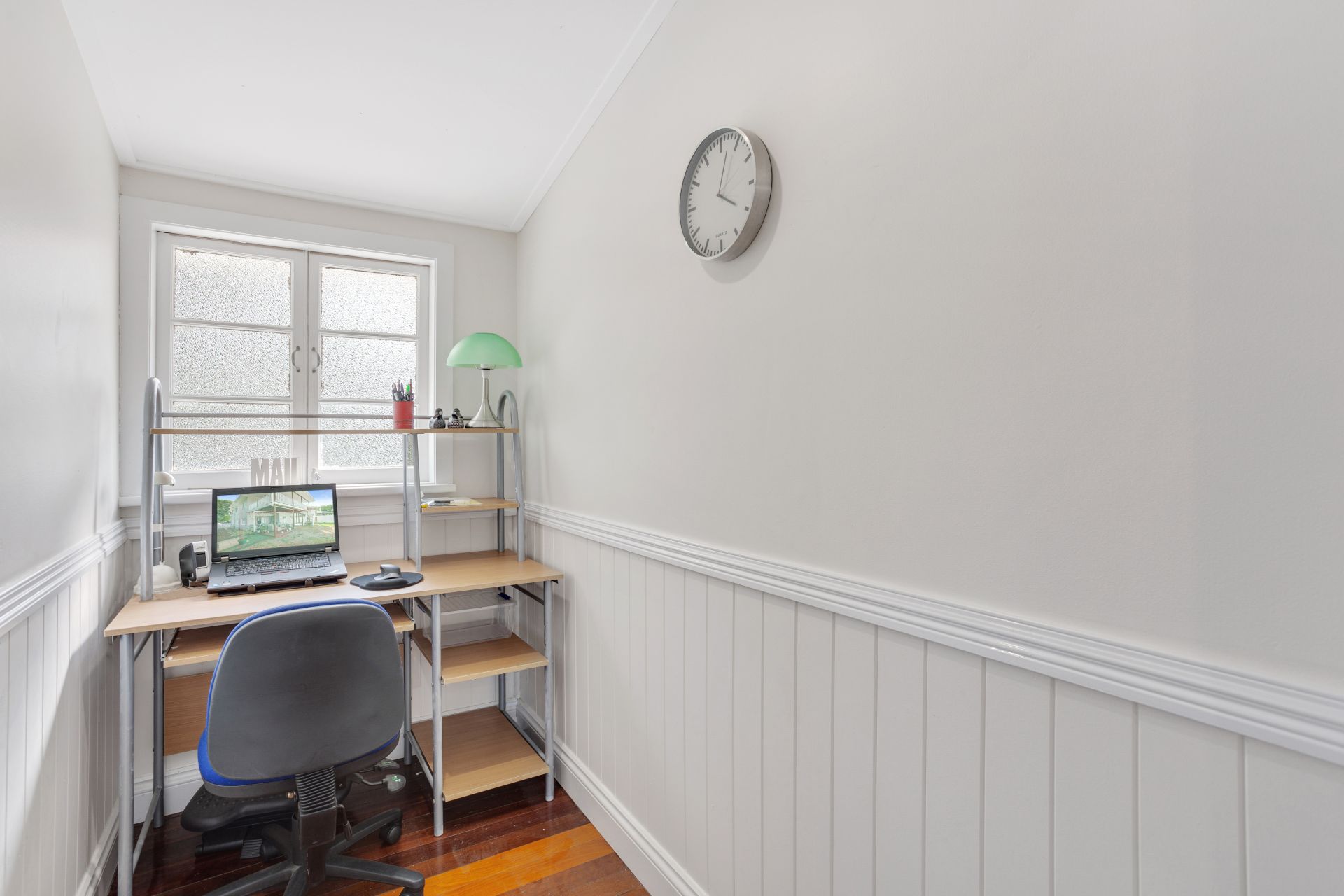 > Located on the top level of the home is bedroom 4 boasting air-conditioning, rich timber flooring and casement windows with roller blinds, down-lighting and pitched ceiling