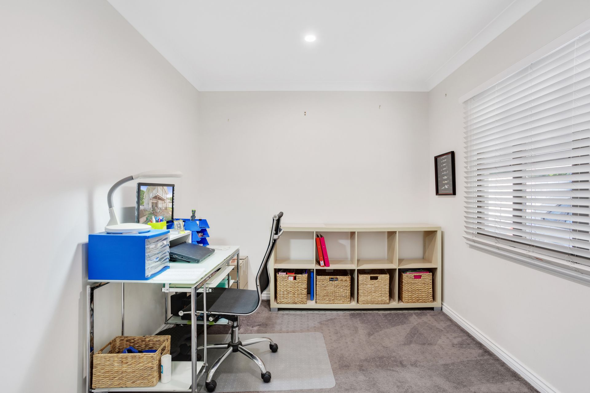 > Located on the entry level of the home is bedroom 2 boasting extra-high ceilings, carpet flooring, built-in-robe, casement windows with venetian blinds, ceiling fan and down-lighting