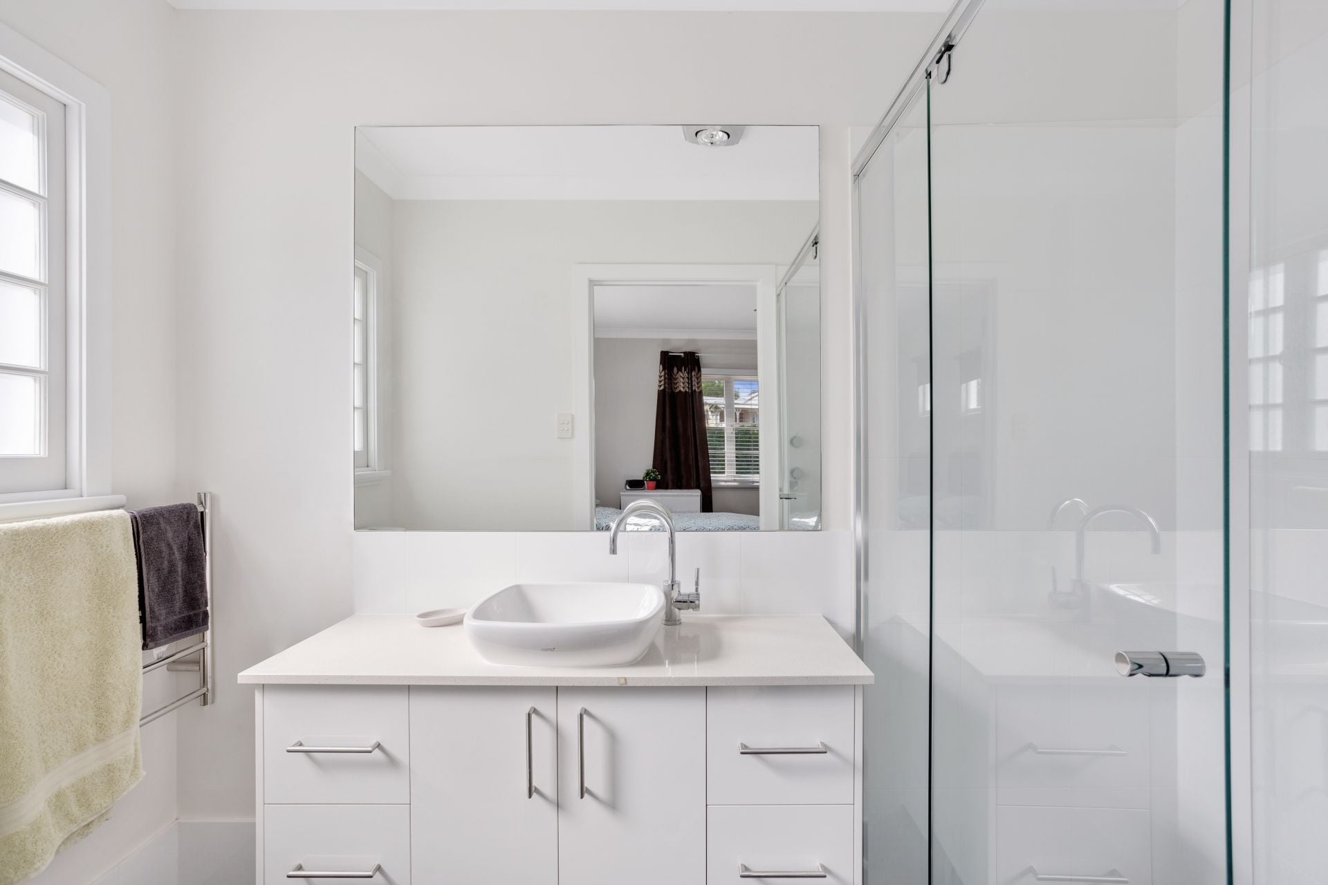 > The ensuite attached to bedroom 1 features a large shower, single basin vanity with plenty of storage, large framed mirror, heated towel rack and toilet