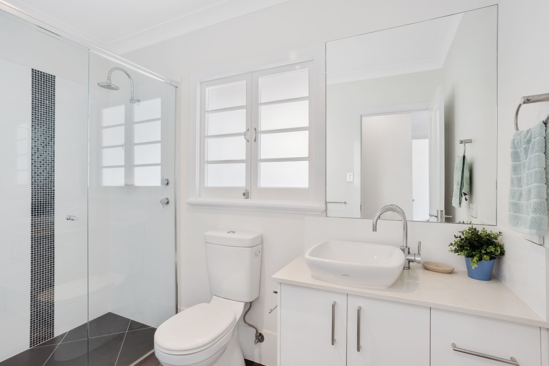 > The main bathroom located on the entry level features a large shower, single basin vanity with plenty of storage, large framed mirror, towel rack and toilet