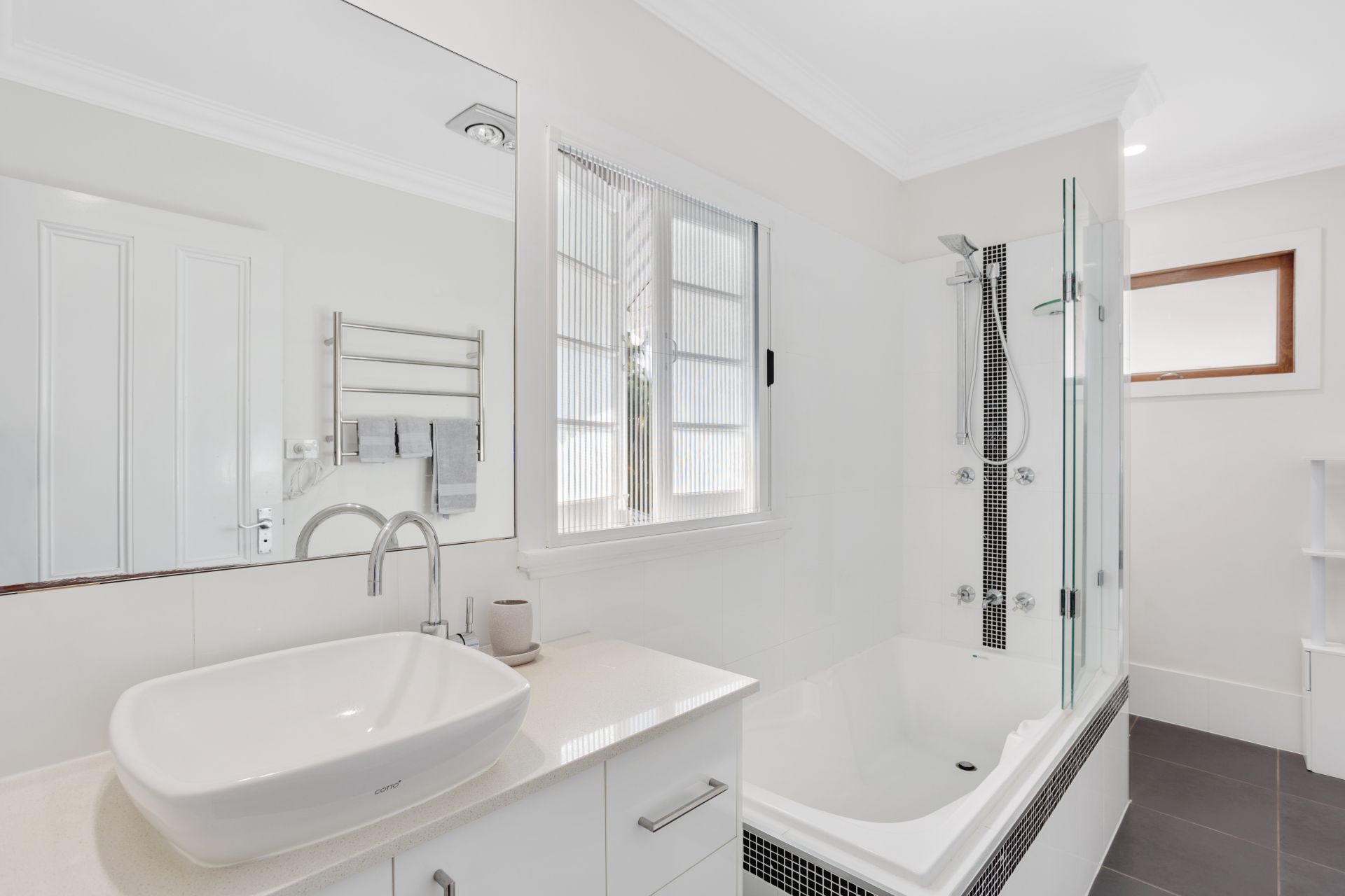 > The main bathroom located on the top level features a shower over bath configuration, single basin vanity with plenty of storage, large framed mirror, heated towel rack and toilet