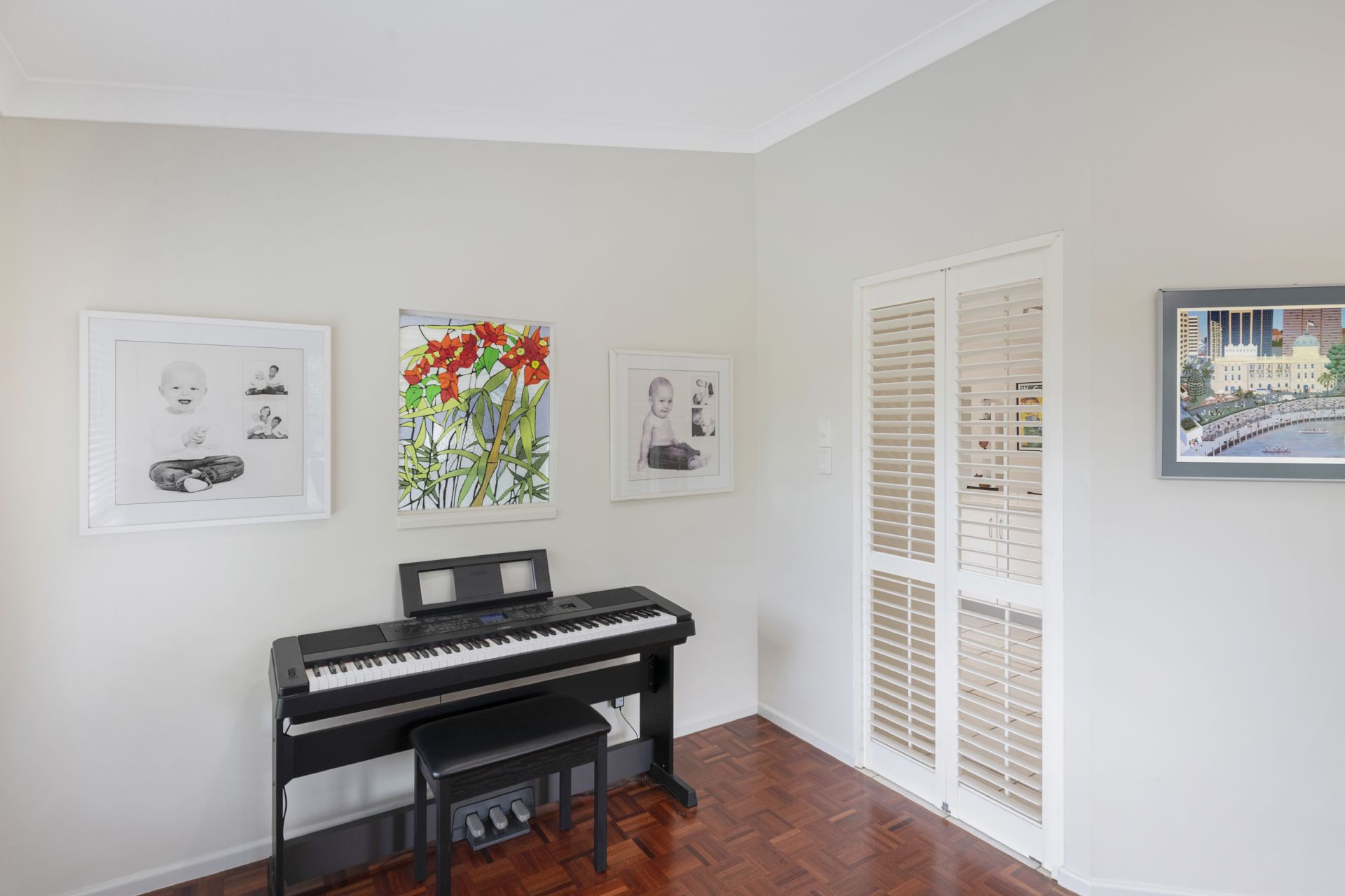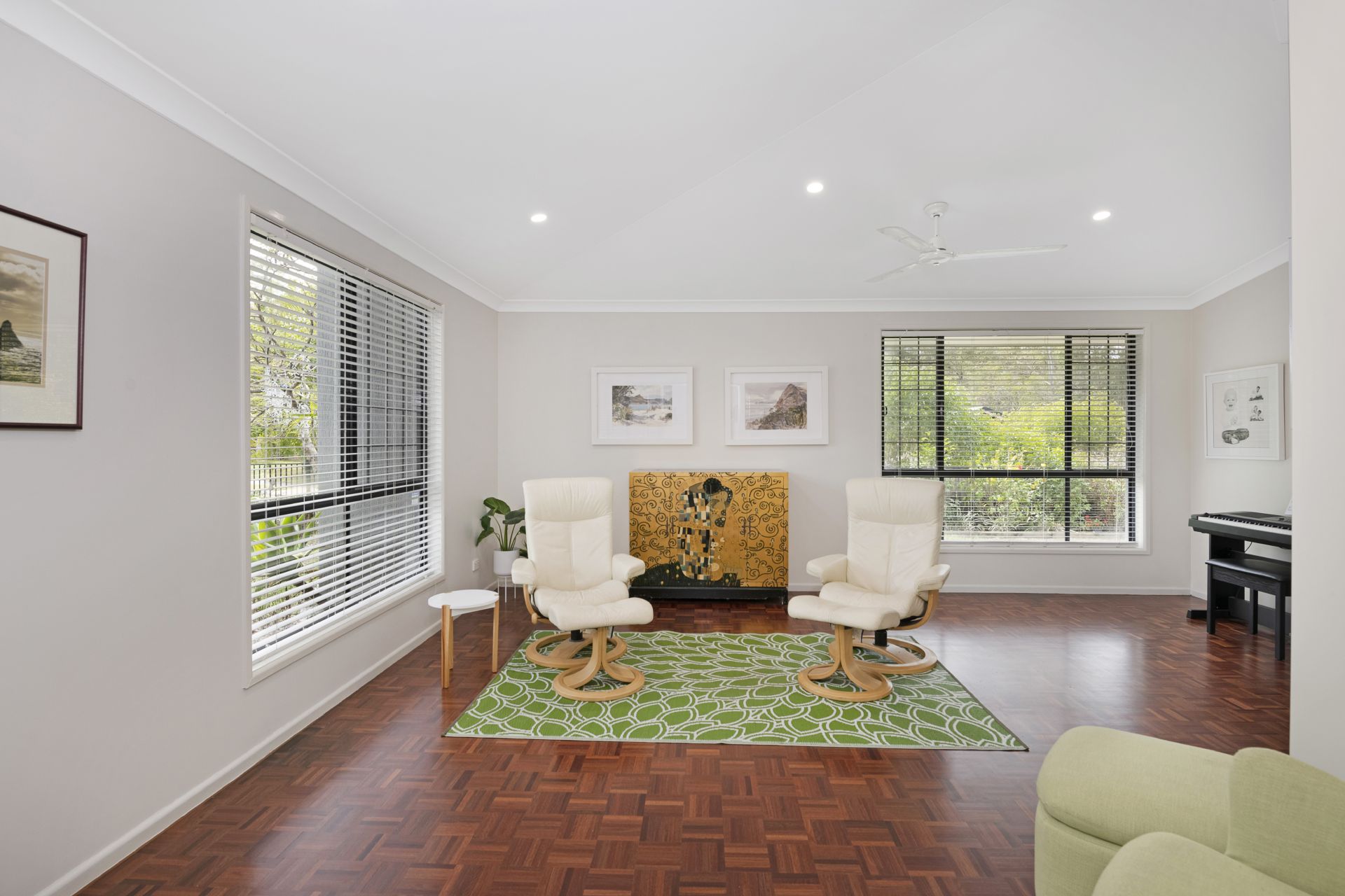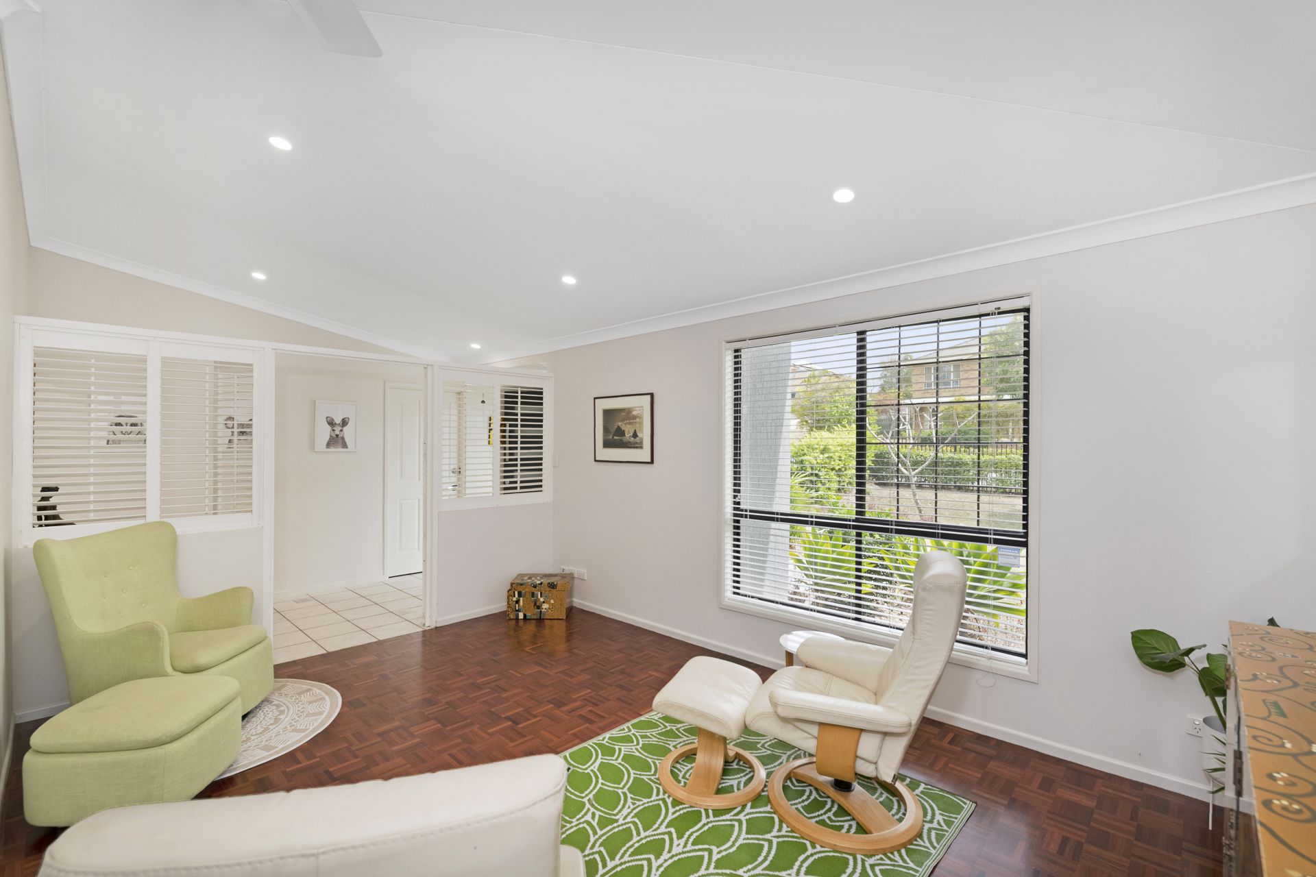 > The open plan formal living/dining area has access through to the kitchen area. Featuring polished finger parquetry timber flooring, ceiling fan, security screens, plantation shutters and LED down-lights throughout.